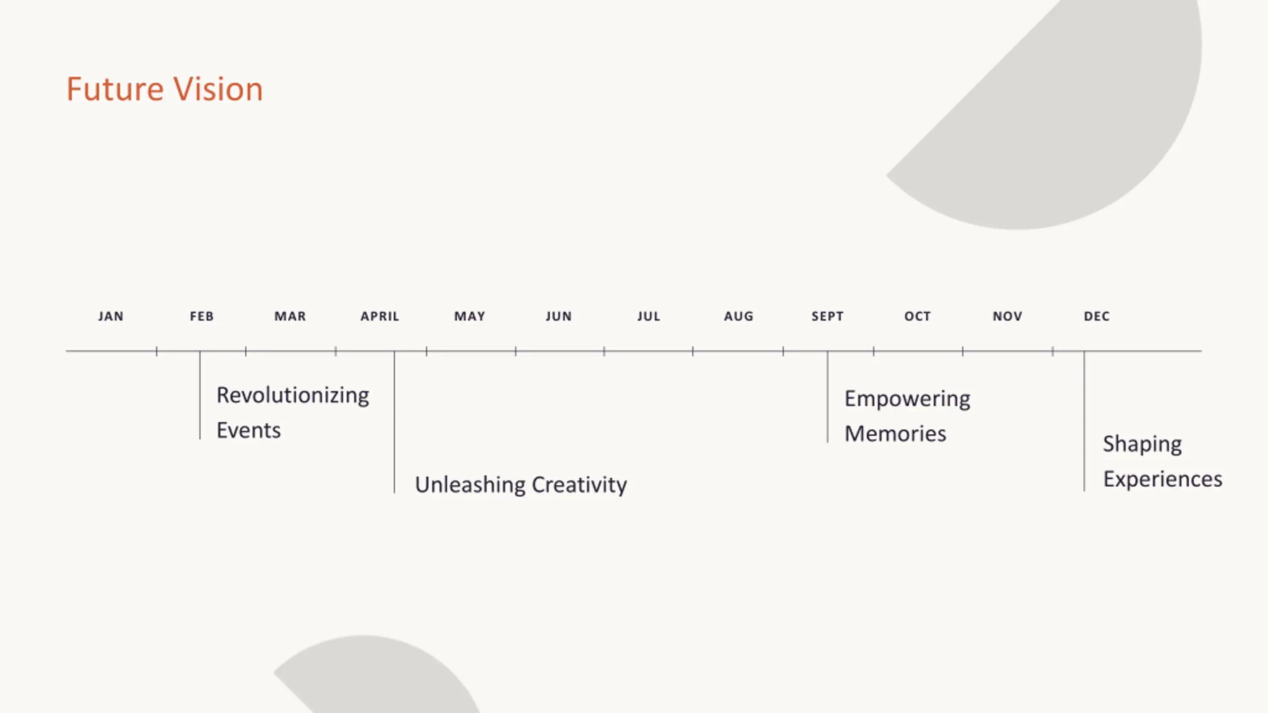 Future Vision JAN FEB MAR APRIL MAY JUN JUL AUG SEPT OCT NOV DEC Revolutionizing Events Empowering Memories Shaping Experiences Unleashing Creativity