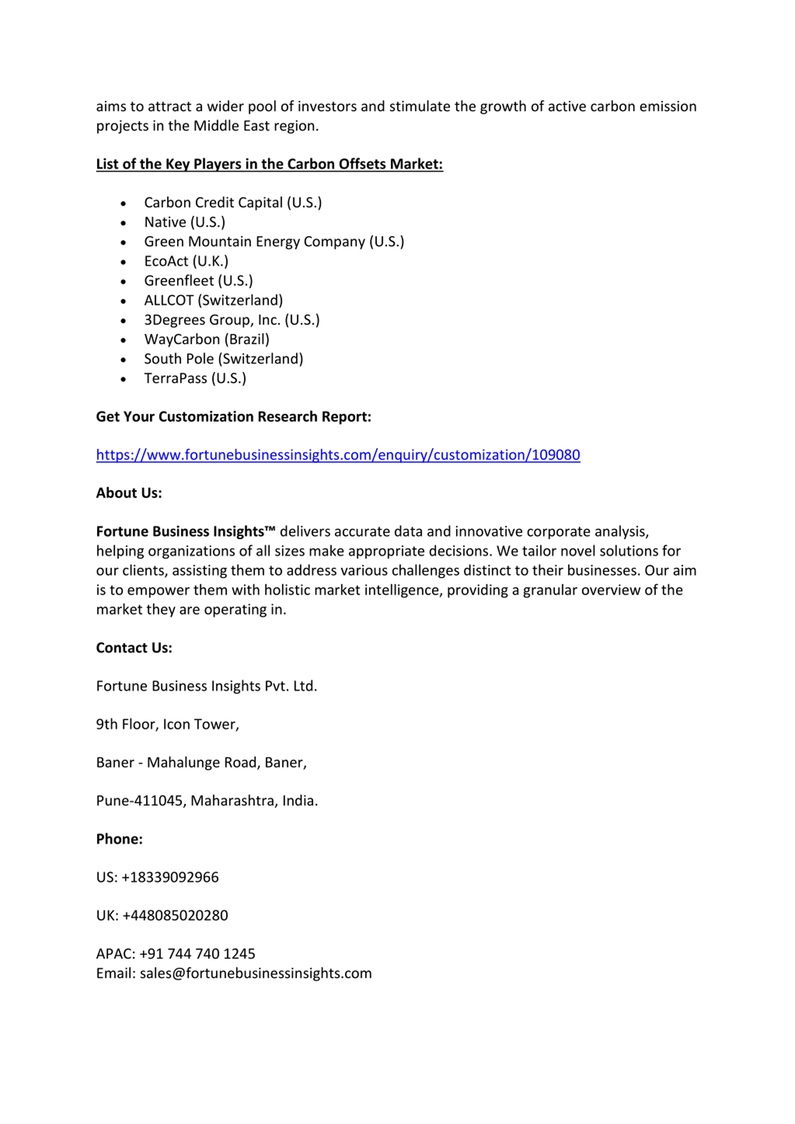 aims to attract a wider pool of investors and stimulate the growth of active carbon emission projects in the Middle East region. List of the Key Players in the Carbon Offsets Market: Carbon Credit Capital (U.S.) Native (U.S.) Green Mountain Energy Company (U.S.) EcoAct (U.K.) Greenfleet (U.S.) ALLCOT (Switzerland) 3Degrees Group, Inc. (U.S.) WayCarbon (Brazil) South Pole (Switzerland) TerraPass (U.S.) Get Your Customization Research Report: https://www.fortunebusinessinsights.com/enquiry/customization/109080 About Us: Fortune Business Insights delivers accurate data and innovative corporate analysis, helping organizations of all sizes make appropriate decisions. We tailor novel solutions for our clients, assisting them to address various challenges distinct to their businesses. Our aim is to empower them with holistic market intelligence, providing a granular overview of the market they are operating in. Contact Us: Fortune Business Insights Pvt. Ltd. 9th Floor, Icon Tower, Baner - Mahalunge Road, Baner, Pune-411045, Maharashtra, India. Phone: US: +18339092966 UK: +448085020280 APAC: +91 744 740 1245 Email: sales@fortunebusinessinsights.com