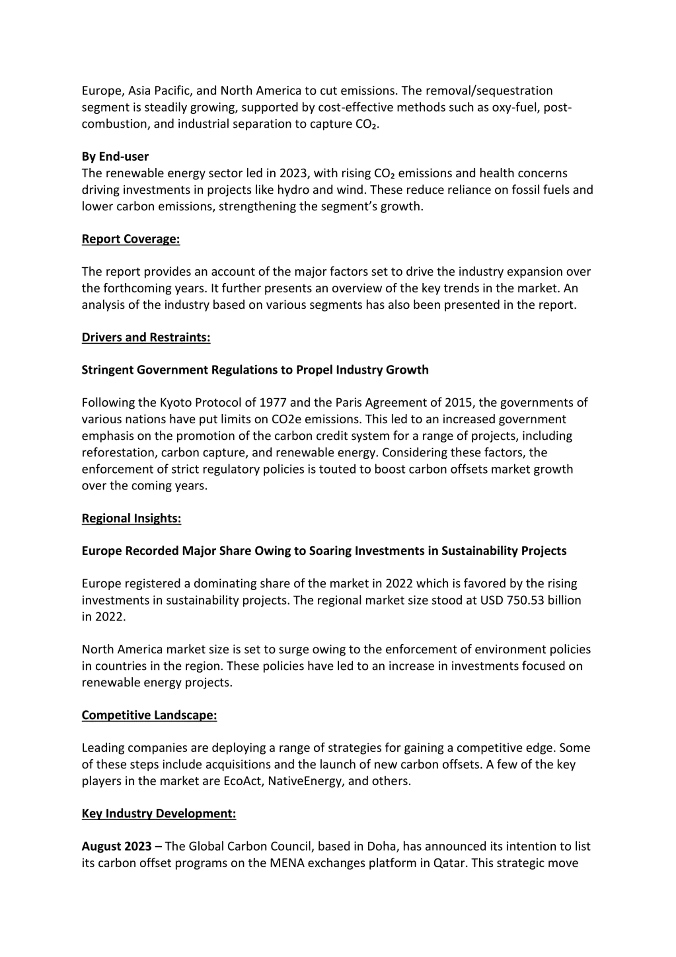 Europe, Asia Pacific, and North America to cut emissions. The removal/sequestration segment is steadily growing, supported by cost-effective methods such as oxy-fuel, post- combustion, and industrial separation to capture CO . By End-user The renewable energy sector led in 2023, with rising CO emissions and health concerns driving investments in projects like hydro and wind. These reduce reliance on fossil fuels and lower carbon emissions, strengthening the segment s growth. Report Coverage: The report provides an account of the major factors set to drive the industry expansion over the forthcoming years. It further presents an overview of the key trends in the market. An analysis of the industry based on various segments has also been presented in the report. Drivers and Restraints: Stringent Government Regulations to Propel Industry Growth Following the Kyoto Protocol of 1977 and the Paris Agreement of 2015, the governments of various nations have put limits on CO2e emissions. This led to an increased government emphasis on the promotion of the carbon credit system for a range of projects, including reforestation, carbon capture, and renewable energy. Considering these factors, the enforcement of strict regulatory policies is touted to boost carbon offsets market growth over the coming years. Regional Insights: Europe Recorded Major Share Owing to Soaring Investments in Sustainability Projects Europe registered a dominating share of the market in 2022 which is favored by the rising investments in sustainability projects. The regional market size stood at USD 750.53 billion in 2022. North America market size is set to surge owing to the enforcement of environment policies in countries in the region. These policies have led to an increase in investments focused on renewable energy projects. Competitive Landscape: Leading companies are deploying a range of strategies for gaining a competitive edge. Some of these steps include acquisitions and the launch of new carbon offsets. A few of the key players in the market are EcoAct, NativeEnergy, and others. Key Industry Development: August 2023 The Global Carbon Council, based in Doha, has announced its intention to list its carbon offset programs on the MENA exchanges platform in Qatar. This strategic move