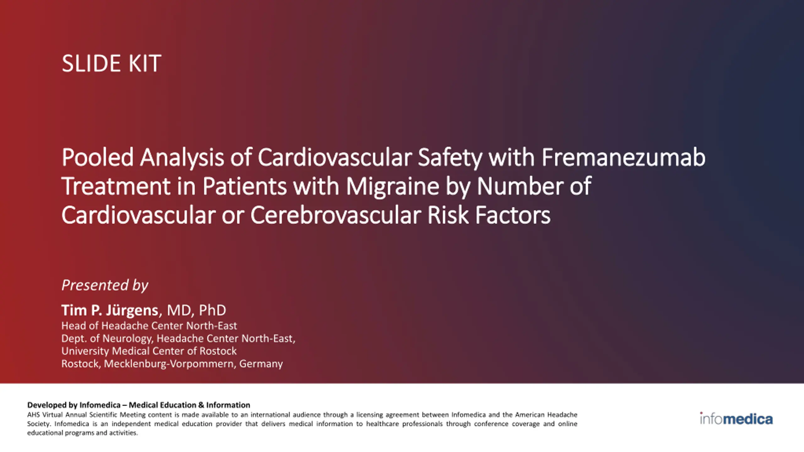 SLIDE KIT Pooled Analysis of Cardiovascular Safety with Pooled Analysis of Cardiovascular Safety with Fremanezumab Treatment in Patients with Migraine by Number of Treatment in Patients with Migraine by Number of Cardiovascular or Cerebrovascular Risk Factors Cardiovascular or Cerebrovascular Risk Factors Fremanezumab Presented by Tim P. J rgens, MD, PhD Head of Headache Center North-East Dept. of Neurology, Headache Center North-East, University Medical Center of Rostock Rostock, Mecklenburg-Vorpommern, Germany Developed by Infomedica Medical Education& Information AHS Virtual Annual Scientific Meeting content is made available to an international audience through a licensing agreement between Infomedica and the American Headache Society. Infomedica is an independent medical education provider that delivers medical information to healthcare professionals through conference coverage and online educational programs and activities.