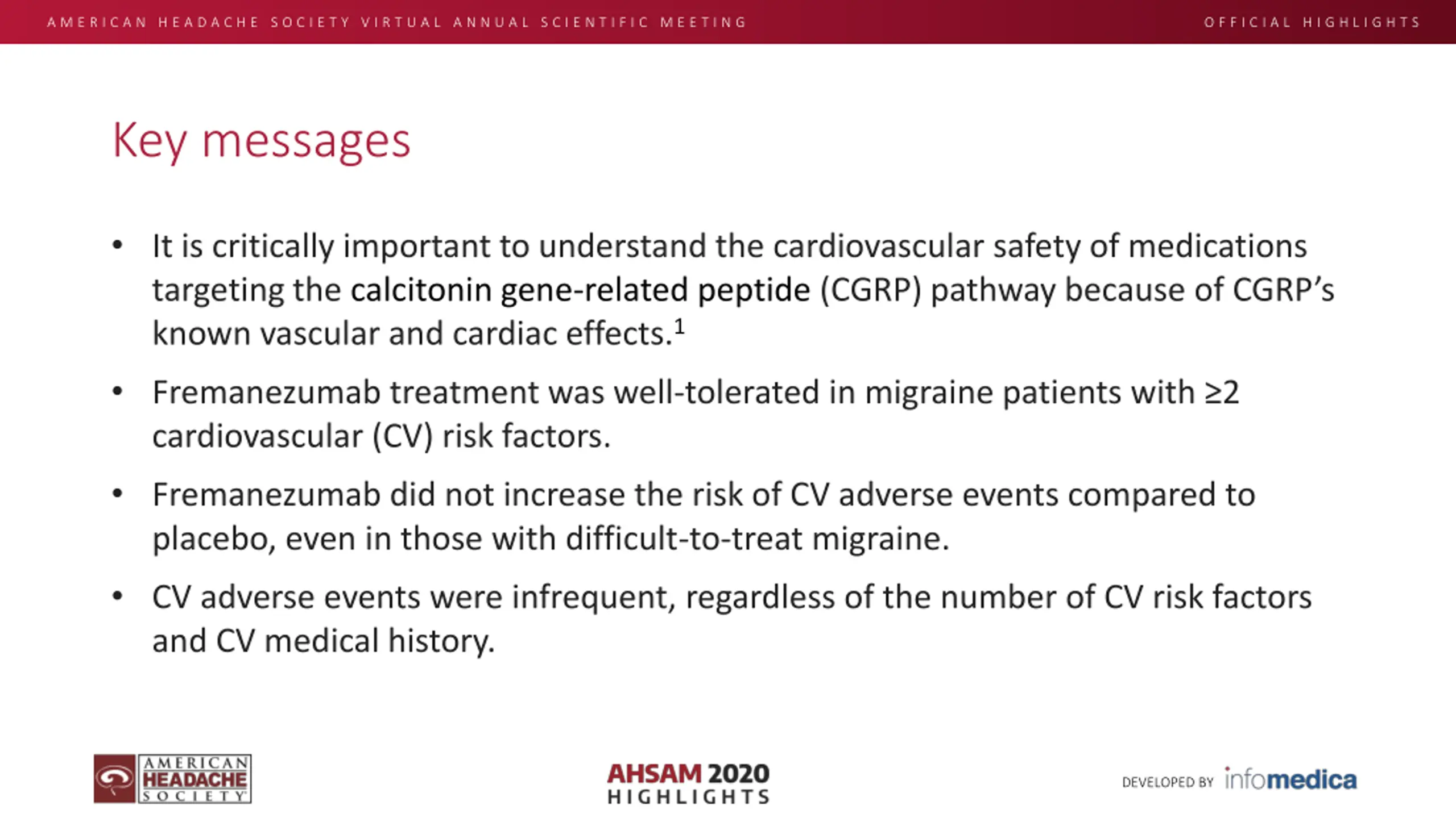 A M E R I C A N H E A D A C H E S O C I E T Y V I R T U A L A N N U A L S C I E N T I F I C M E E T I N G O F F I C I A L H I G H L I G H T S Key messages It is critically important to understand the cardiovascular safety of medications targeting the calcitonin gene-related peptide (CGRP) pathway because of CGRP s known vascular and cardiac effects.1 Fremanezumab treatment was well-tolerated in migraine patients with 2 cardiovascular (CV) risk factors. Fremanezumab did not increase the risk of CV adverse events compared to placebo, even in those with difficult-to-treat migraine. CV adverse events were infrequent, regardless of the number of CV risk factors and CV medical history. DEVELOPED BY