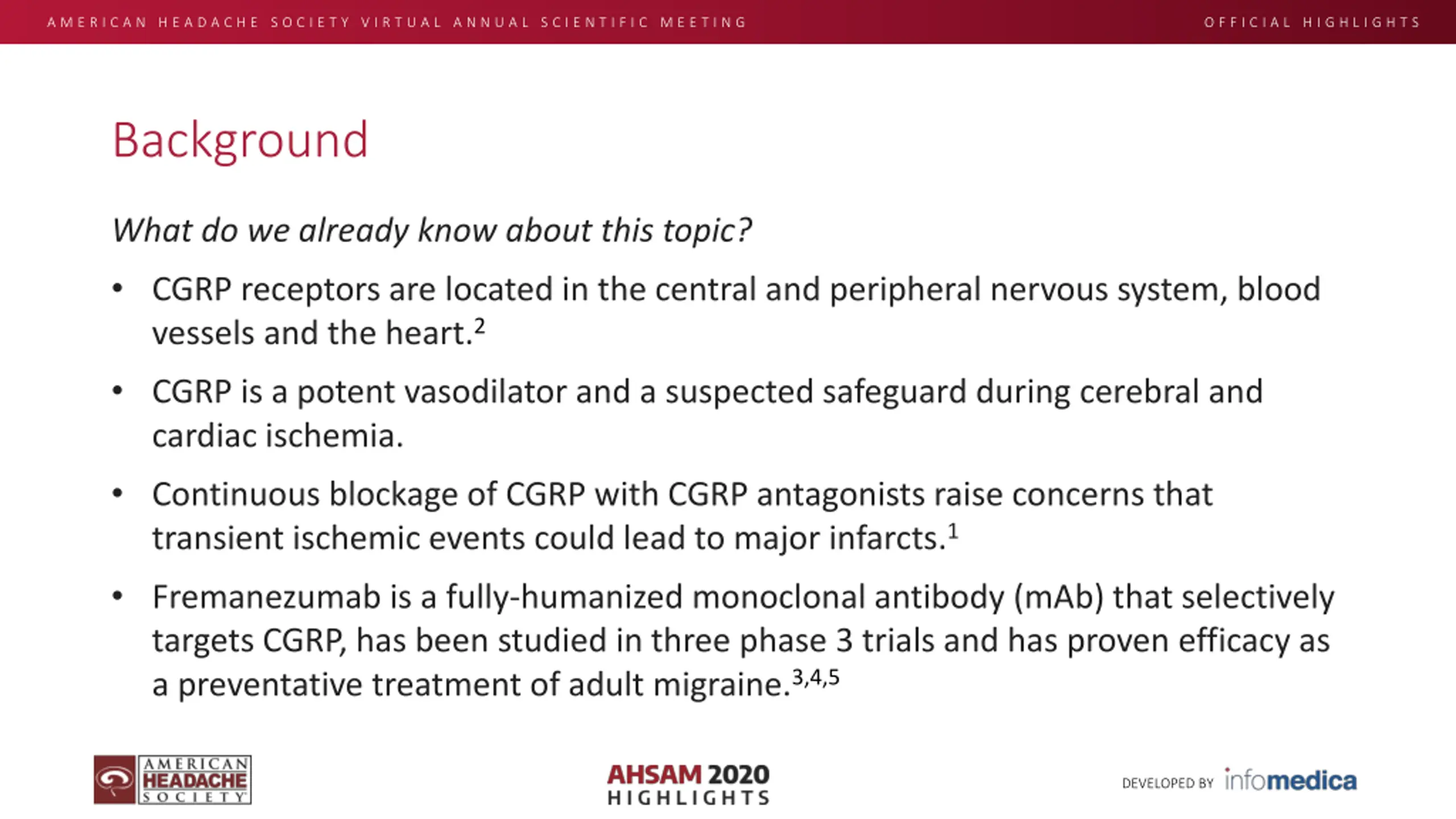 A M E R I C A N H E A D A C H E S O C I E T Y V I R T U A L A N N U A L S C I E N T I F I C M E E T I N G O F F I C I A L H I G H L I G H T S Background What do we already know about this topic? CGRP receptors are located in the central and peripheral nervous system, blood vessels and the heart.2 CGRP is a potent vasodilator and a suspected safeguard during cerebral and cardiac ischemia. Continuous blockage of CGRP with CGRP antagonists raise concerns that transient ischemic events could lead to major infarcts.1 Fremanezumab is a fully-humanized monoclonal antibody (mAb) that selectively targets CGRP, has been studied in three phase 3 trials and has proven efficacy as a preventative treatment of adult migraine.3,4,5 DEVELOPED BY