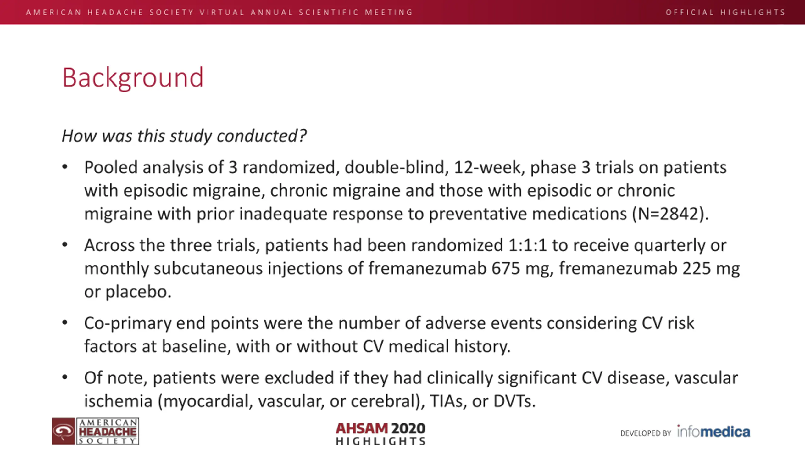 A M E R I C A N H E A D A C H E S O C I E T Y V I R T U A L A N N U A L S C I E N T I F I C M E E T I N G O F F I C I A L H I G H L I G H T S Background How was this study conducted? Pooled analysis of 3 randomized, double-blind, 12-week, phase 3 trials on patients with episodic migraine, chronic migraine and those with episodic or chronic migraine with prior inadequate response to preventative medications (N=2842). Across the three trials, patients had been randomized 1:1:1 to receive quarterly or monthly subcutaneous injections of fremanezumab 675 mg, fremanezumab 225 mg or placebo. Co-primary end points were the number of adverse events considering CV risk factors at baseline, with or without CV medical history. Of note, patients were excluded if they had clinically significant CV disease, vascular ischemia (myocardial, vascular, or cerebral), TIAs, or DVTs. DEVELOPED BY