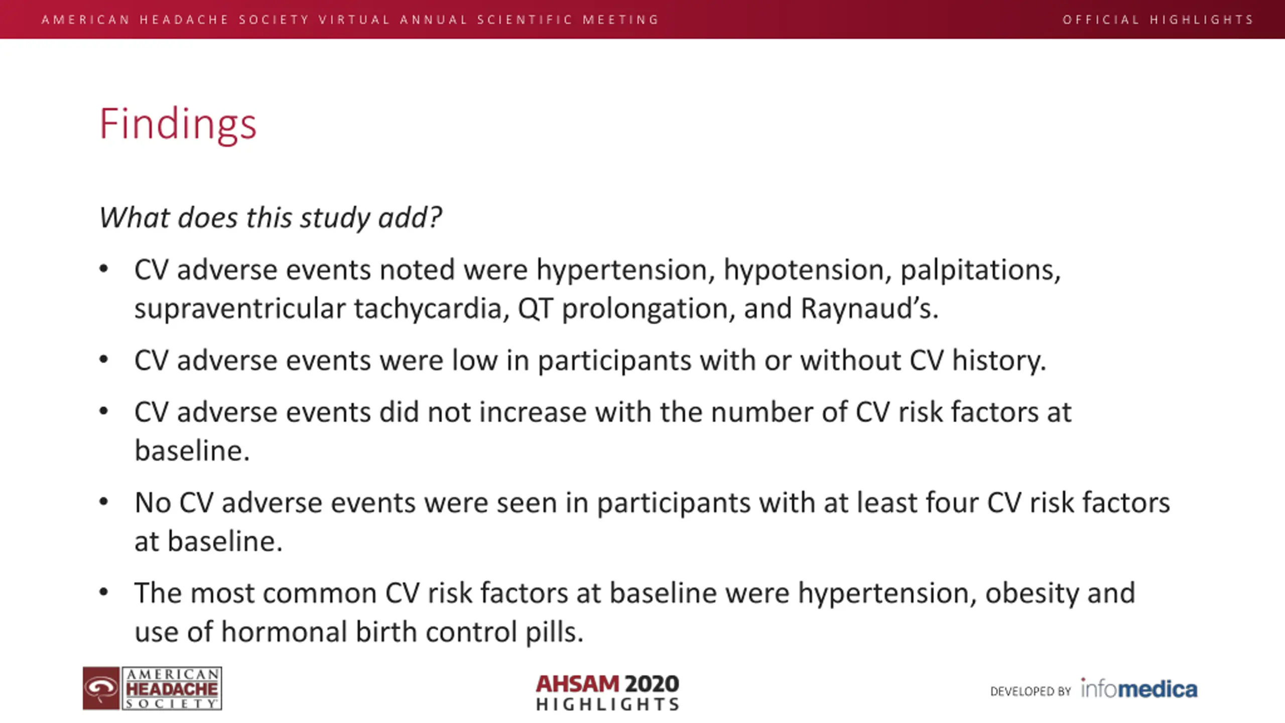 A M E R I C A N H E A D A C H E S O C I E T Y V I R T U A L A N N U A L S C I E N T I F I C M E E T I N G O F F I C I A L H I G H L I G H T S Findings What does this study add? CV adverse events noted were hypertension, hypotension, palpitations, supraventricular tachycardia, QT prolongation, and Raynaud s. CV adverse events were low in participants with or without CV history. CV adverse events did not increase with the number of CV risk factors at baseline. No CV adverse events were seen in participants with at least four CV risk factors at baseline. The most common CV risk factors at baseline were hypertension, obesity and use of hormonal birth control pills. DEVELOPED BY