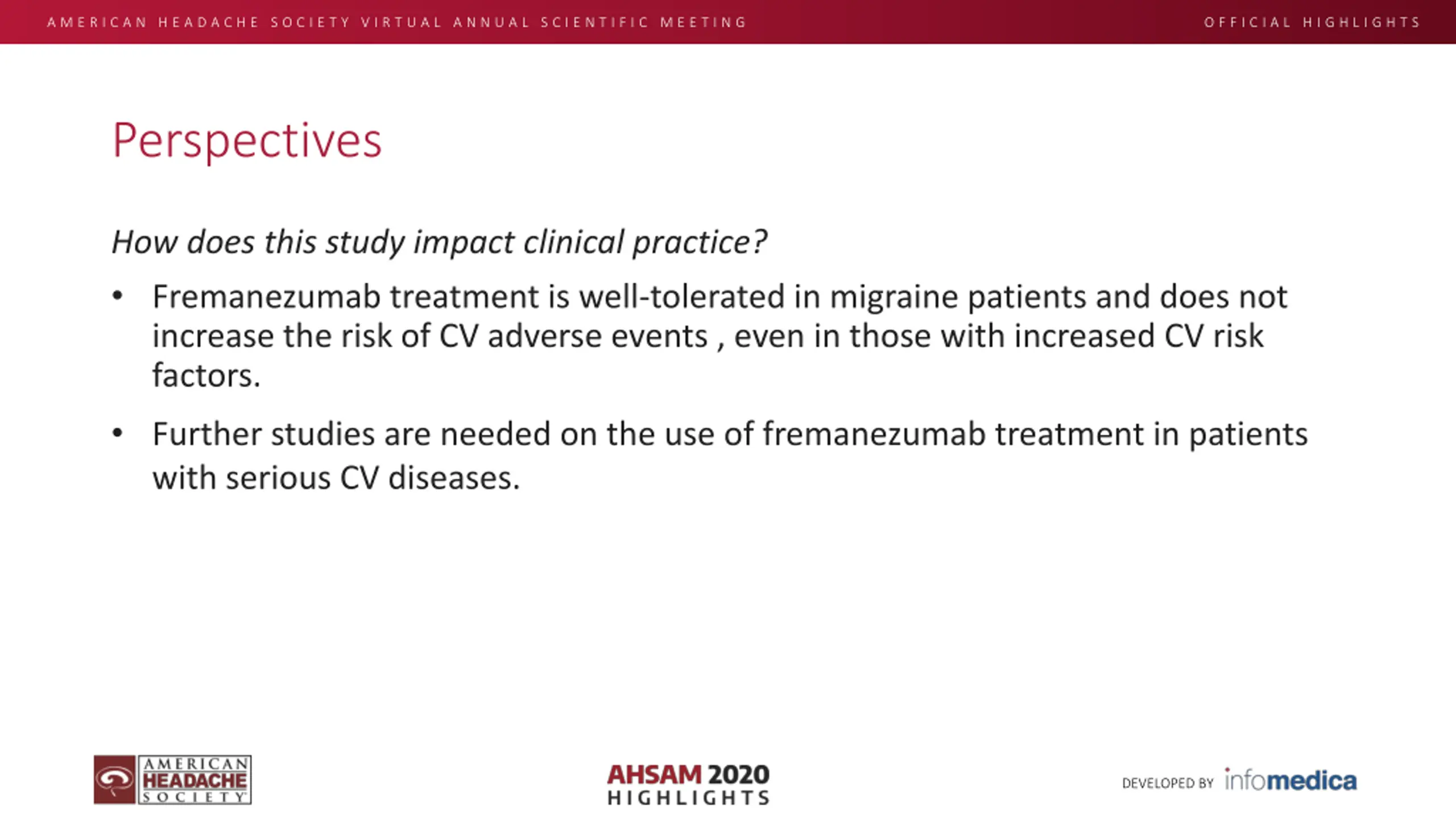 A M E R I C A N H E A D A C H E S O C I E T Y V I R T U A L A N N U A L S C I E N T I F I C M E E T I N G O F F I C I A L H I G H L I G H T S Perspectives How does this study impact clinical practice? Fremanezumab treatment is well-tolerated in migraine patients and does not increase the risk of CV adverse events , even in those with increased CV risk factors. Further studies are needed on the use of fremanezumab treatment in patients with serious CV diseases. DEVELOPED BY