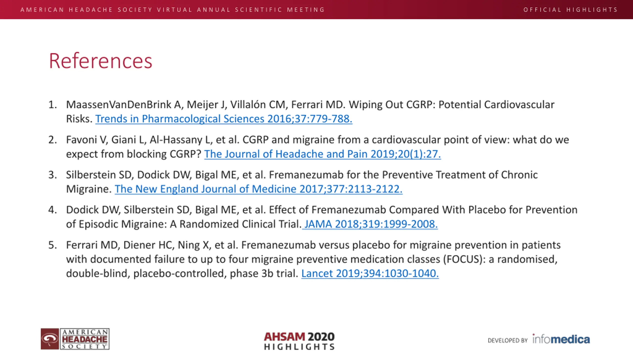 A M E R I C A N H E A D A C H E S O C I E T Y V I R T U A L A N N U A L S C I E N T I F I C M E E T I N G O F F I C I A L H I G H L I G H T S References 1. MaassenVanDenBrink A, Meijer J, Villal n CM, Ferrari MD. Wiping Out CGRP: Potential Cardiovascular Risks. Trends in Pharmacological Sciences 2016;37:779-788. 2. Favoni V, Giani L, Al-Hassany L, et al. CGRP and migraine from a cardiovascular point of view: what do we expect from blocking CGRP? The Journal of Headache and Pain 2019;20(1):27. 3. Silberstein SD, Dodick DW, Bigal ME, et al. Fremanezumab for the Preventive Treatment of Chronic Migraine. The New England Journal of Medicine 2017;377:2113-2122. 4. Dodick DW, Silberstein SD, Bigal ME, et al. Effect of Fremanezumab Compared With Placebo for Prevention of Episodic Migraine: A Randomized Clinical Trial. JAMA 2018;319:1999-2008. 5. Ferrari MD, Diener HC, Ning X, et al. Fremanezumab versus placebo for migraine prevention in patients with documented failure to up to four migraine preventive medication classes (FOCUS): a randomised, double-blind, placebo-controlled, phase 3b trial. Lancet 2019;394:1030-1040. DEVELOPED BY
