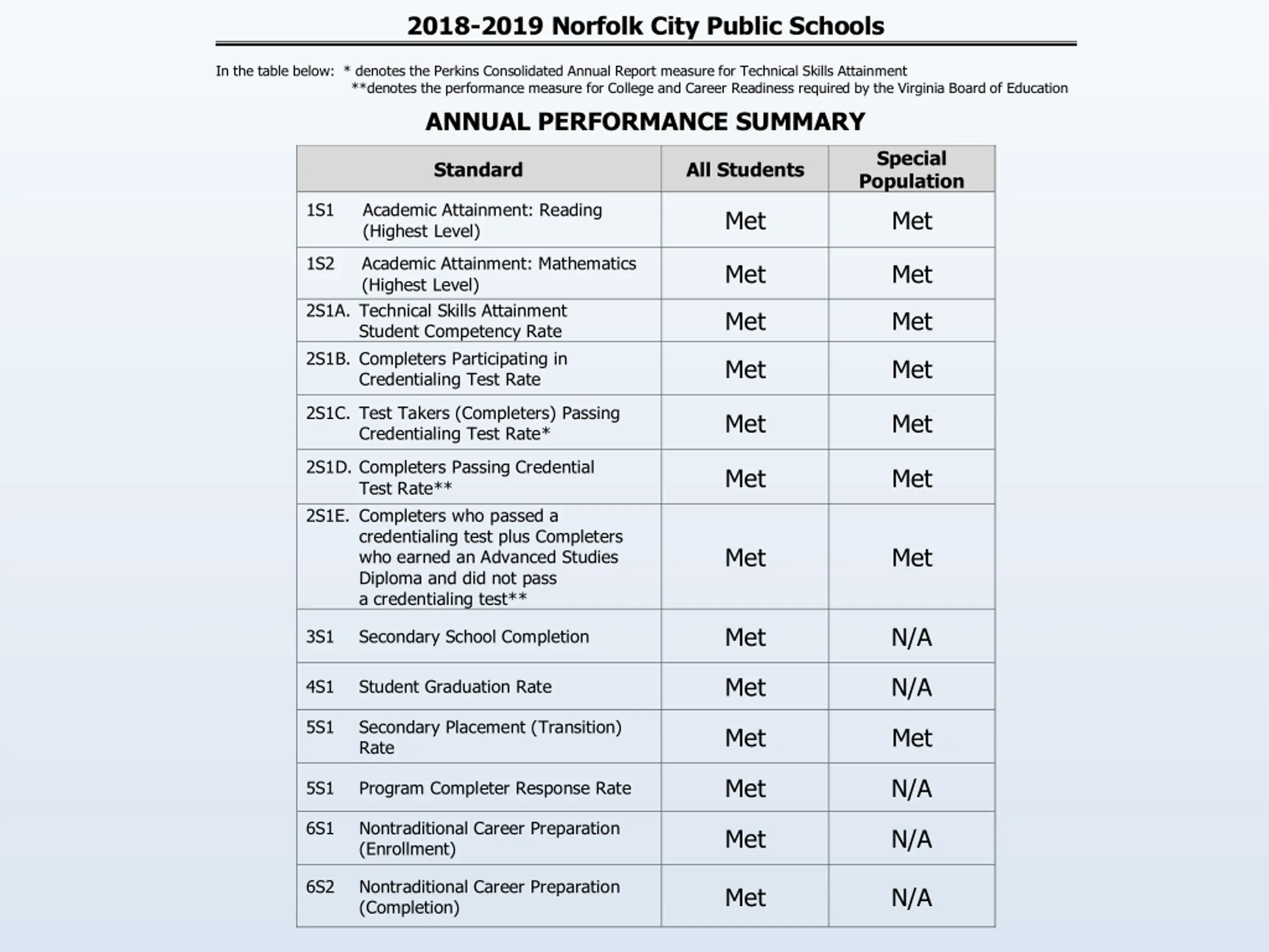 2018-2019 Norfolk City Public Schools In the table below: * denotes the Perkins Consolidated Annual Report measure for Technical Skills Attainment **denotes the performance measure for College and Career Readiness required by the Virginia Board of Education ANNUAL PERFORMANCE SUMMARY Special Population Standard All Students 1S1 Academic Attainment: Reading (Highest Level) Met Met 1S2 2S1A. Technical Skills Attainment Student Competency Rate 2S1B. Completers Participating in Credentialing Test Rate Academic Attainment: Mathematics (Highest Level) Met Met Met Met Met Met 2S1C. Test Takers (Completers) Passing Credentialing Test Rate* Met Met 2S1D. Completers Passing Credential Test Rate** 2S1E. Completers who passed a credentialing test plus Completers who earned an Advanced Studies Diploma and did not pass a credentialing test** Met Met Met Met Met N/A 3S1 Secondary School Completion Met N/A 4S1 Student Graduation Rate 5S1 Secondary Placement (Transition) Rate Met Met Met N/A 5S1 Program Completer Response Rate 6S1 Nontraditional Career Preparation (Enrollment) Met N/A 6S2 Nontraditional Career Preparation (Completion) Met N/A