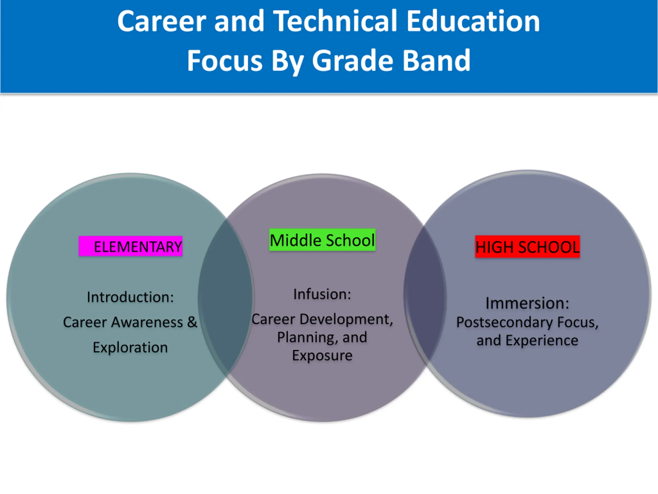 Career and Technical Education Focus By Grade Band Middle School HIGH SCHOOL ELEMENTARY Infusion: Introduction: Immersion: Postsecondary Focus, and Experience Career Development, Planning, and Exposure Career Awareness & Exploration