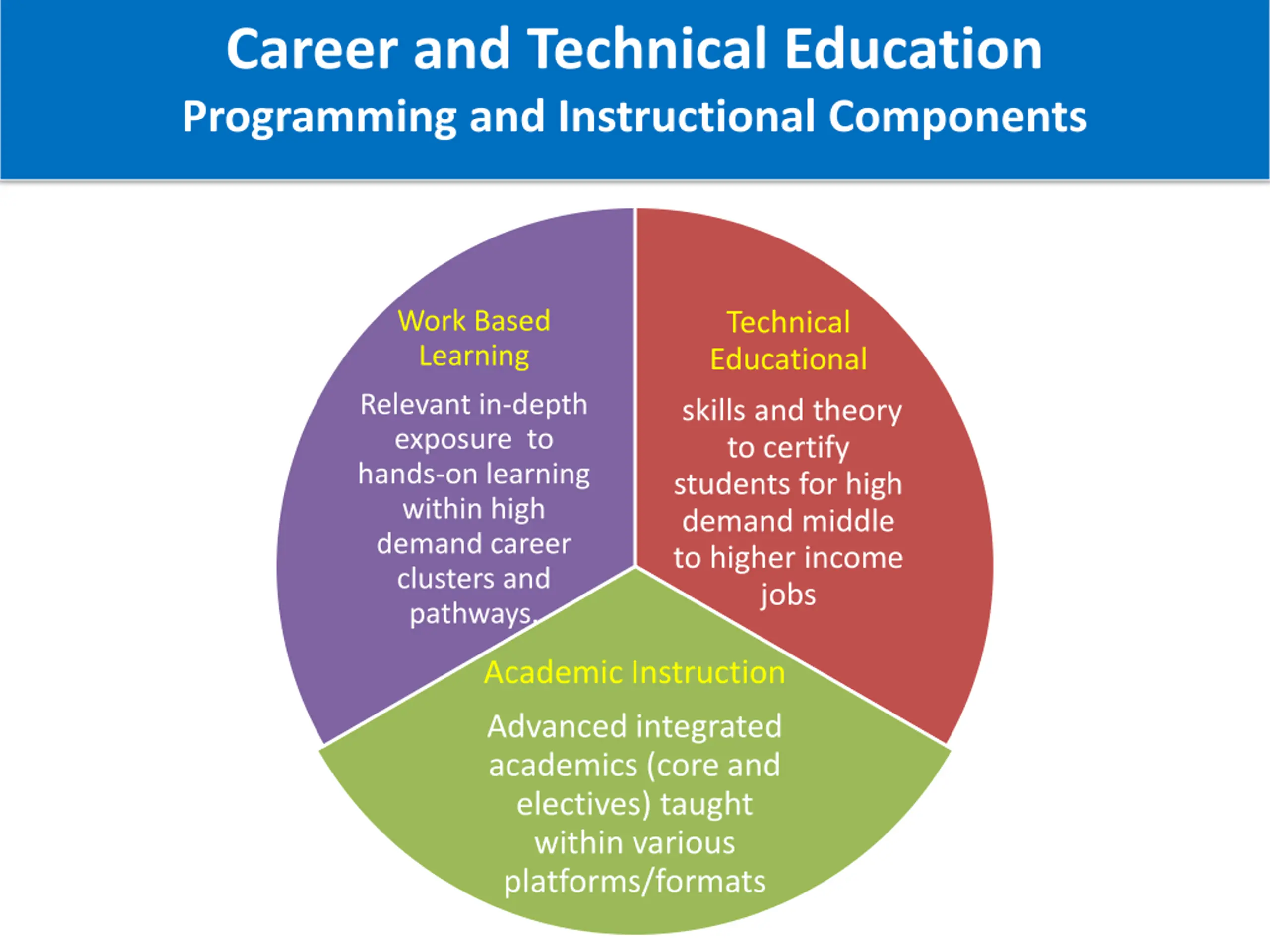 Career and Technical Education Programming and Instructional Components Work Based Learning Technical Educational Relevant in-depth exposure to hands-on learning within high demand career clusters and pathways. skills and theory to certify students for high demand middle to higher income jobs Academic Instruction Advanced integrated academics (core and electives) taught within various platforms/formats