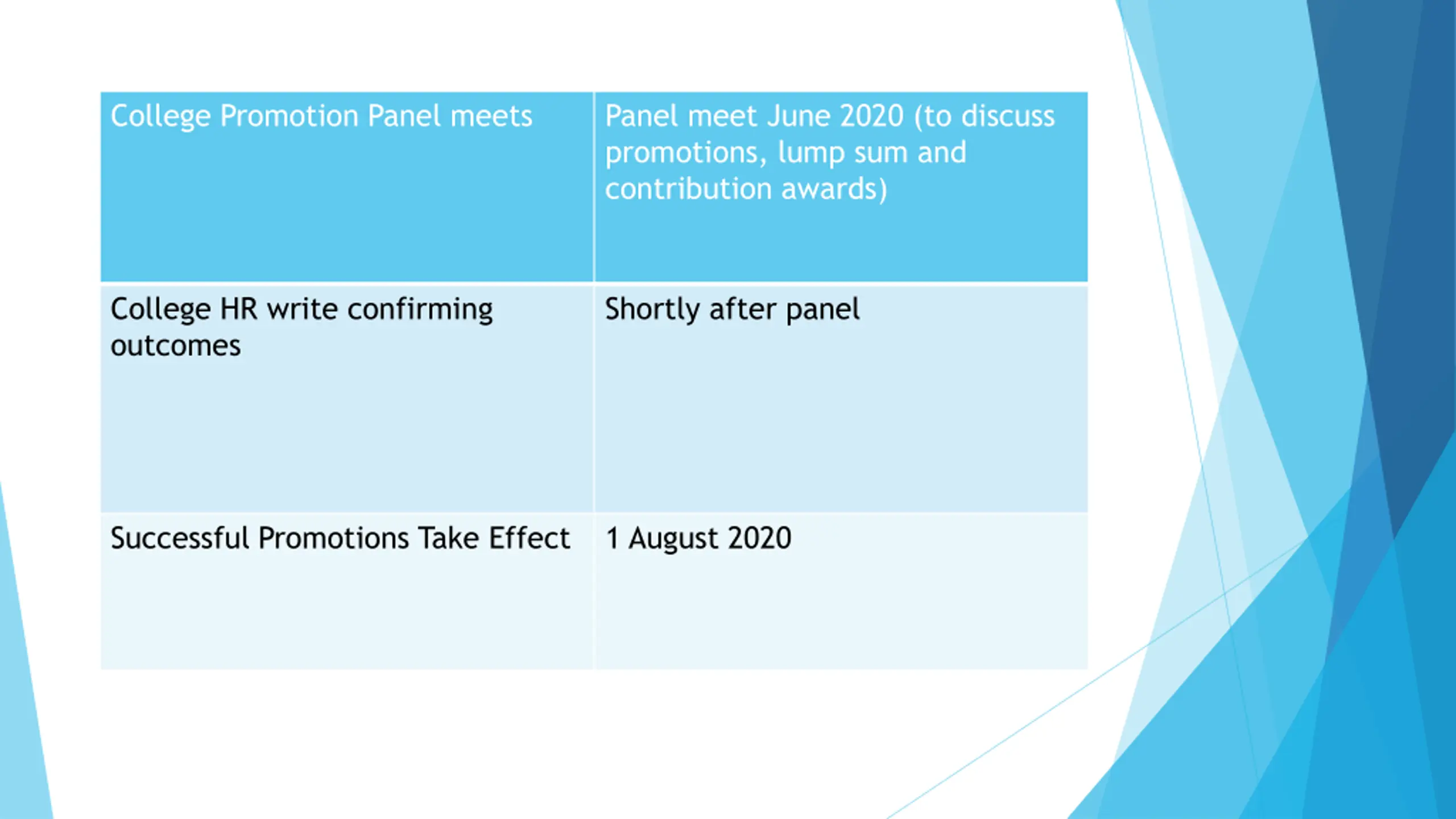College Promotion Panel meets Panel meet June 2020 (to discuss promotions, lump sum and contribution awards) College HR write confirming outcomes Shortly after panel Successful Promotions Take Effect 1 August 2020