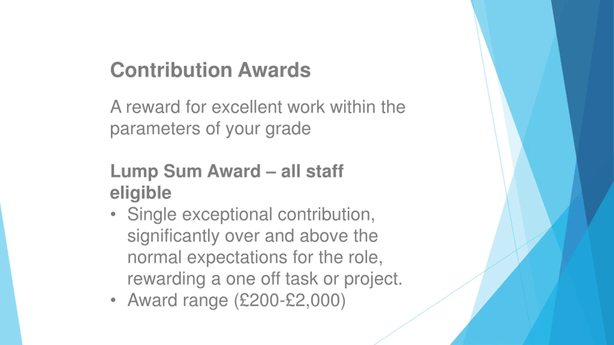 Contribution Awards A reward for excellent work within the parameters of your grade Lump Sum Award all staff eligible Single exceptional contribution, significantly over and above the normal expectations for the role, rewarding a one off task or project. Award range ( 200- 2,000)