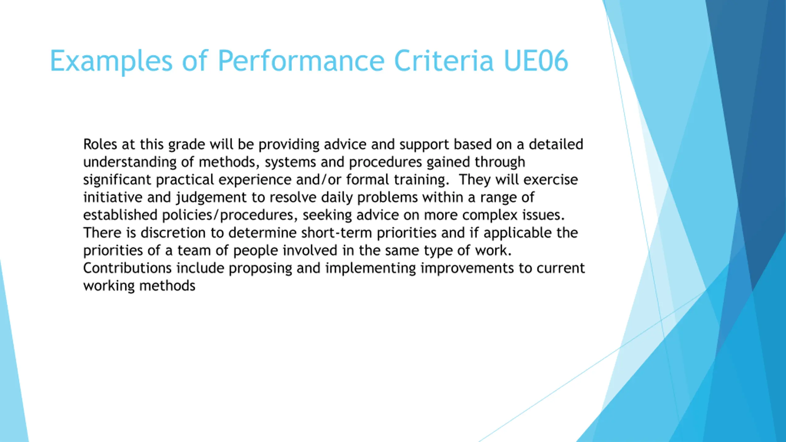 Examples of Performance Criteria UE06 Roles at this grade will be providing advice and support based on a detailed understanding of methods, systems and procedures gained through significant practical experience and/or formal training. They will exercise initiative and judgement to resolve daily problems within a range of established policies/procedures, seeking advice on more complex issues. There is discretion to determine short-term priorities and if applicable the priorities of a team of people involved in the same type of work. Contributions include proposing and implementing improvements to current working methods