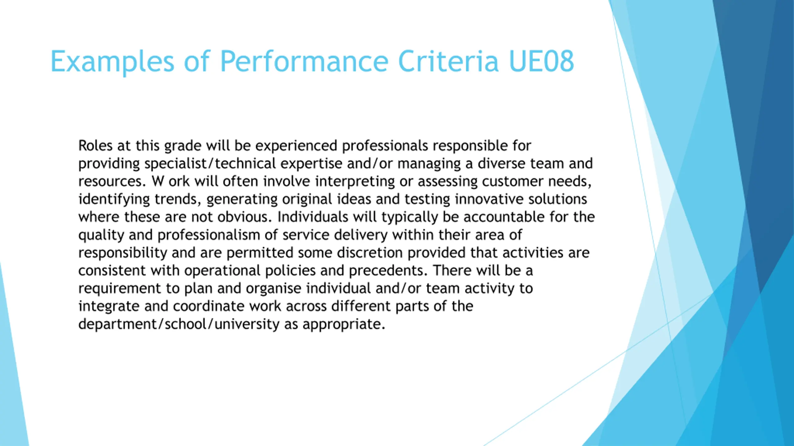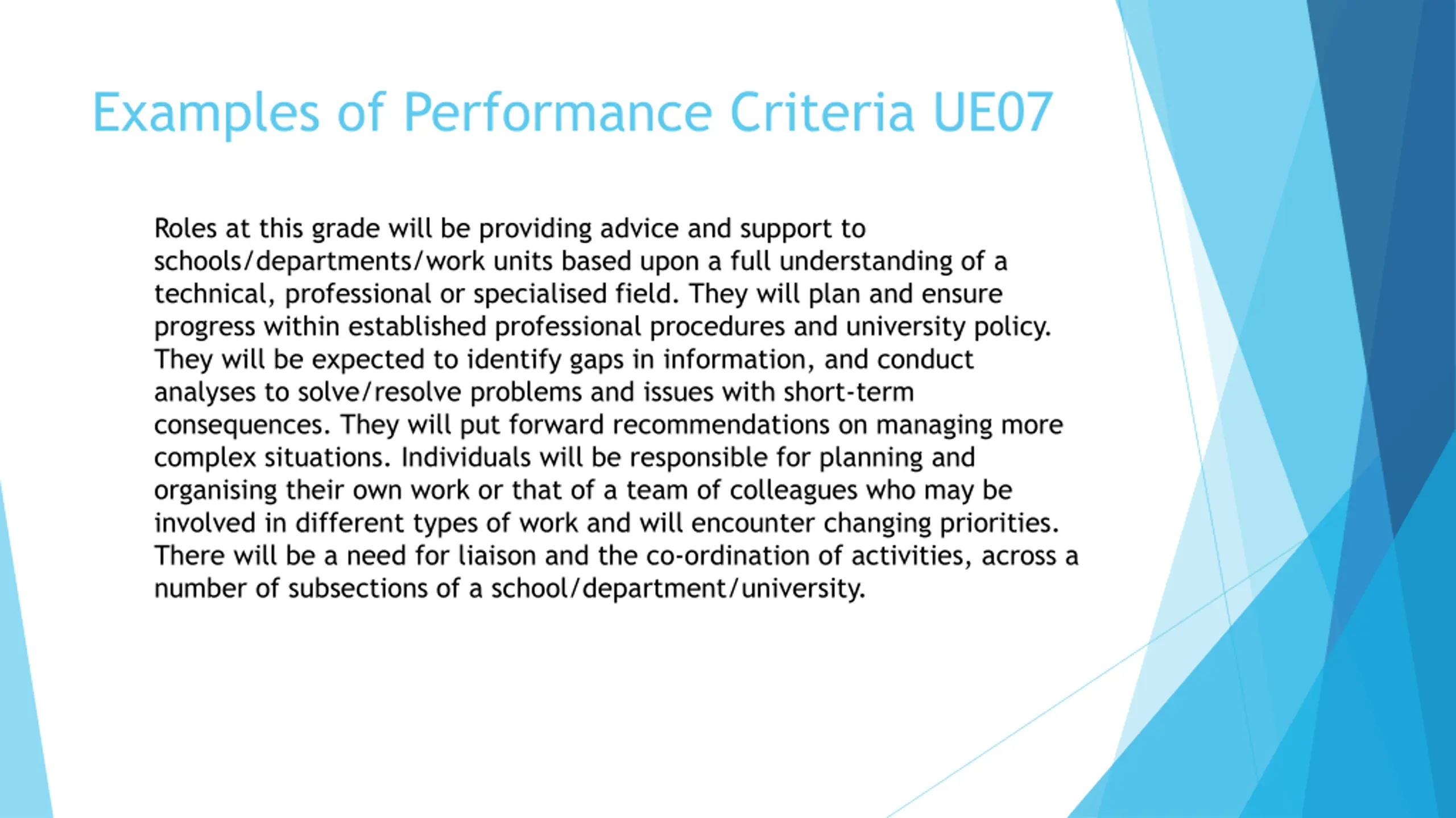 Examples of Performance Criteria UE07 Roles at this grade will be providing advice and support to schools/departments/work units based upon a full understanding of a technical, professional or specialised field. They will plan and ensure progress within established professional procedures and university policy. They will be expected to identify gaps in information, and conduct analyses to solve/resolve problems and issues with short-term consequences. They will put forward recommendations on managing more complex situations. Individuals will be responsible for planning and organising their own work or that of a team of colleagues who may be involved in different types of work and will encounter changing priorities. There will be a need for liaison and the co-ordination of activities, across a number of subsections of a school/department/university.