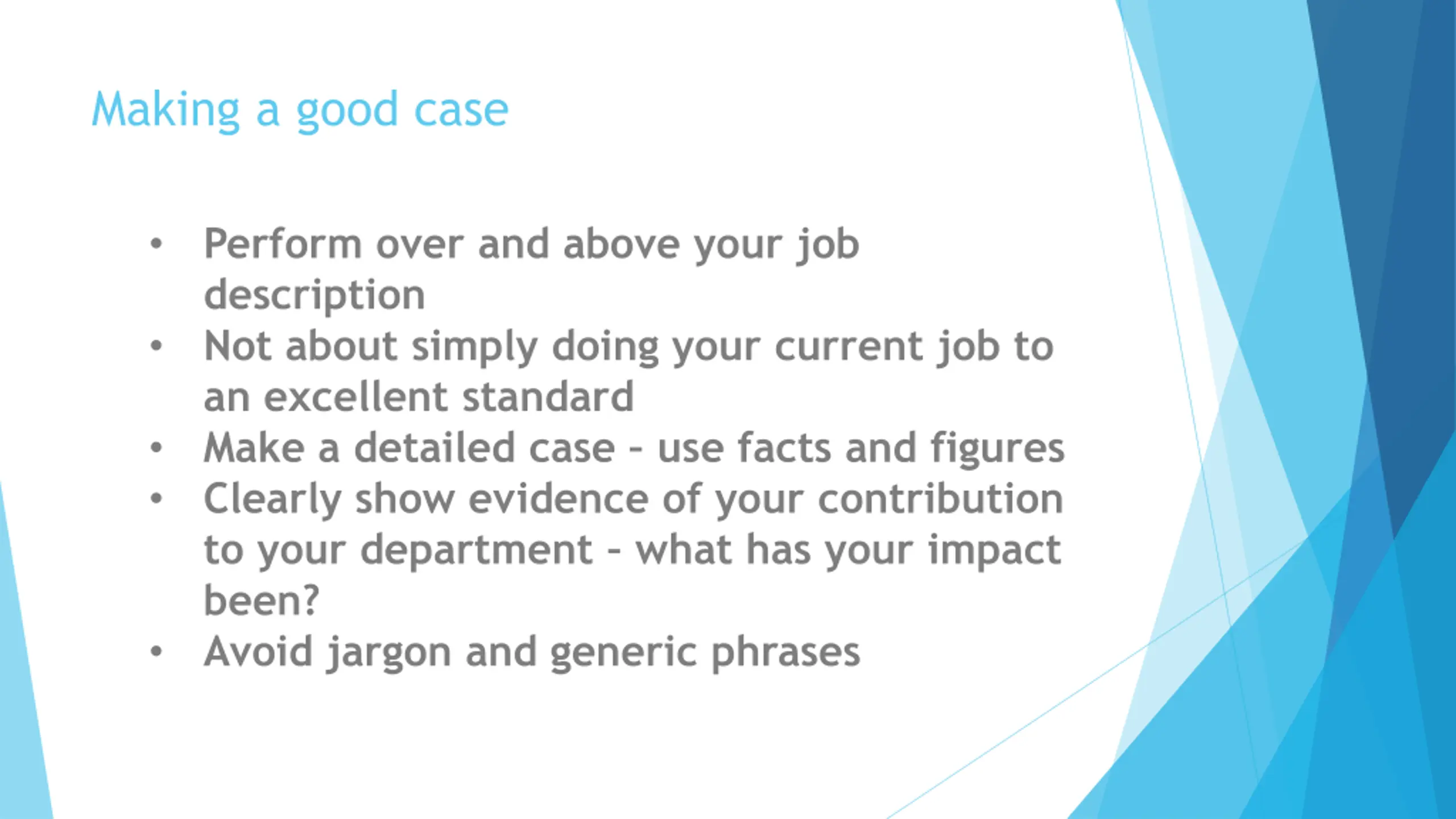 Making a good case Perform over and above your job description Not about simply doing your current job to an excellent standard Make a detailed case use facts and figures Clearly show evidence of your contribution to your department what has your impact been? Avoid jargon and generic phrases