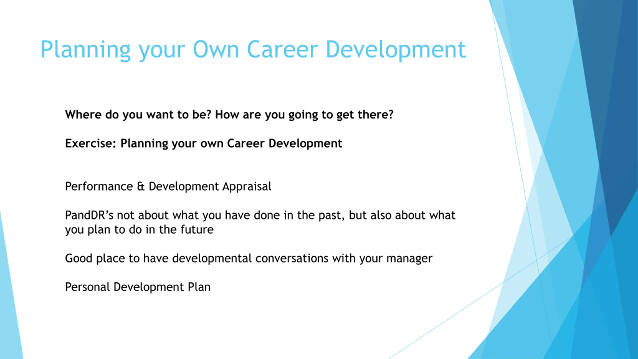 Planning your Own Career Development Where do you want to be? How are you going to get there? Exercise: Planning your own Career Development Performance & Development Appraisal PandDR s not about what you have done in the past, but also about what you plan to do in the future Good place to have developmental conversations with your manager Personal Development Plan