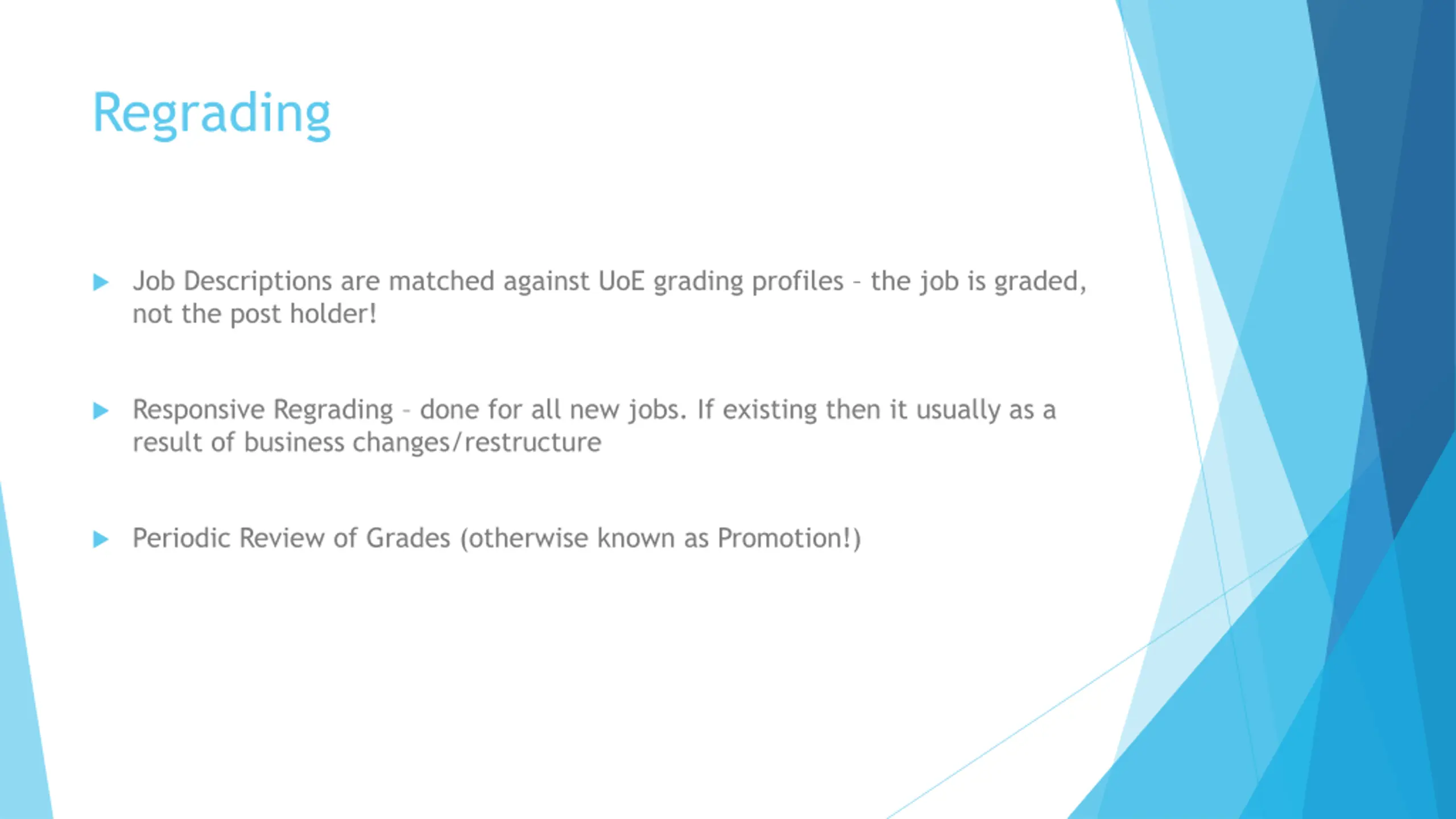Regrading Job Descriptions are matched against UoE grading profiles the job is graded, not the post holder! Responsive Regrading done for all new jobs. If existing then it usually as a result of business changes/restructure Periodic Review of Grades (otherwise known as Promotion!)