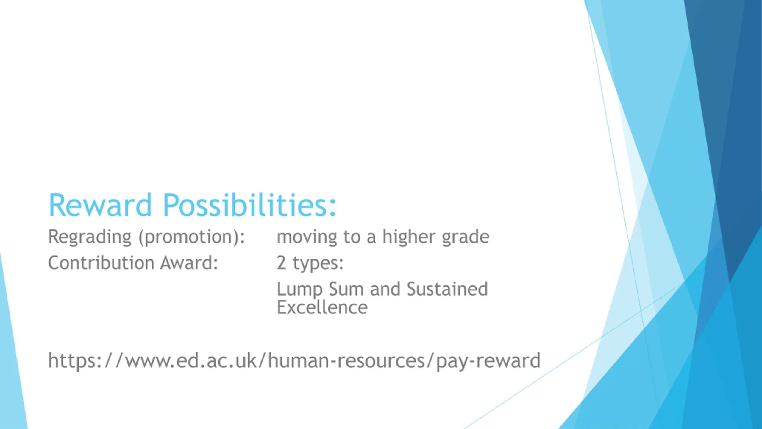 Reward Possibilities: Regrading (promotion): Contribution Award: moving to a higher grade 2 types: Lump Sum and Sustained Excellence https://www.ed.ac.uk/human-resources/pay-reward