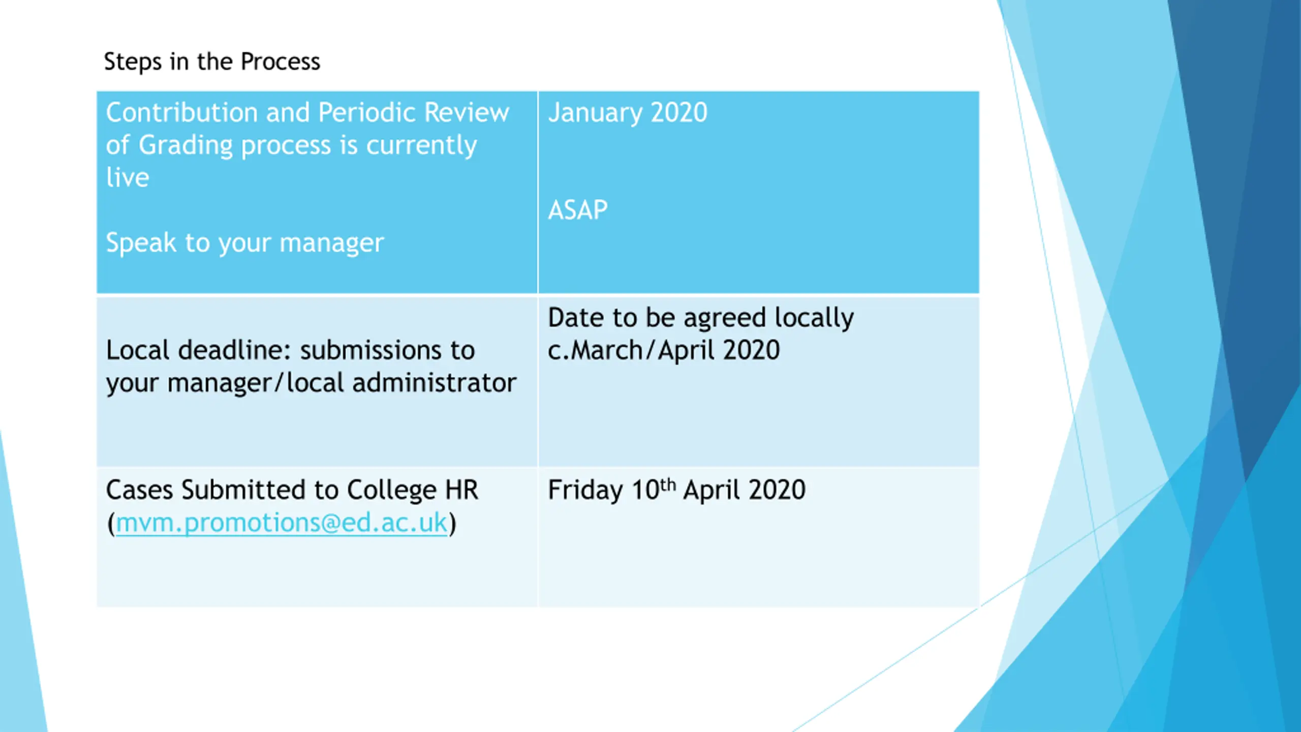Steps in the Process Contribution and Periodic Review of Grading process is currently live January 2020 ASAP Speak to your manager Date to be agreed locally c.March/April 2020 Local deadline: submissions to your manager/local administrator Cases Submitted to College HR (mvm.promotions@ed.ac.uk) Friday 10th April 2020