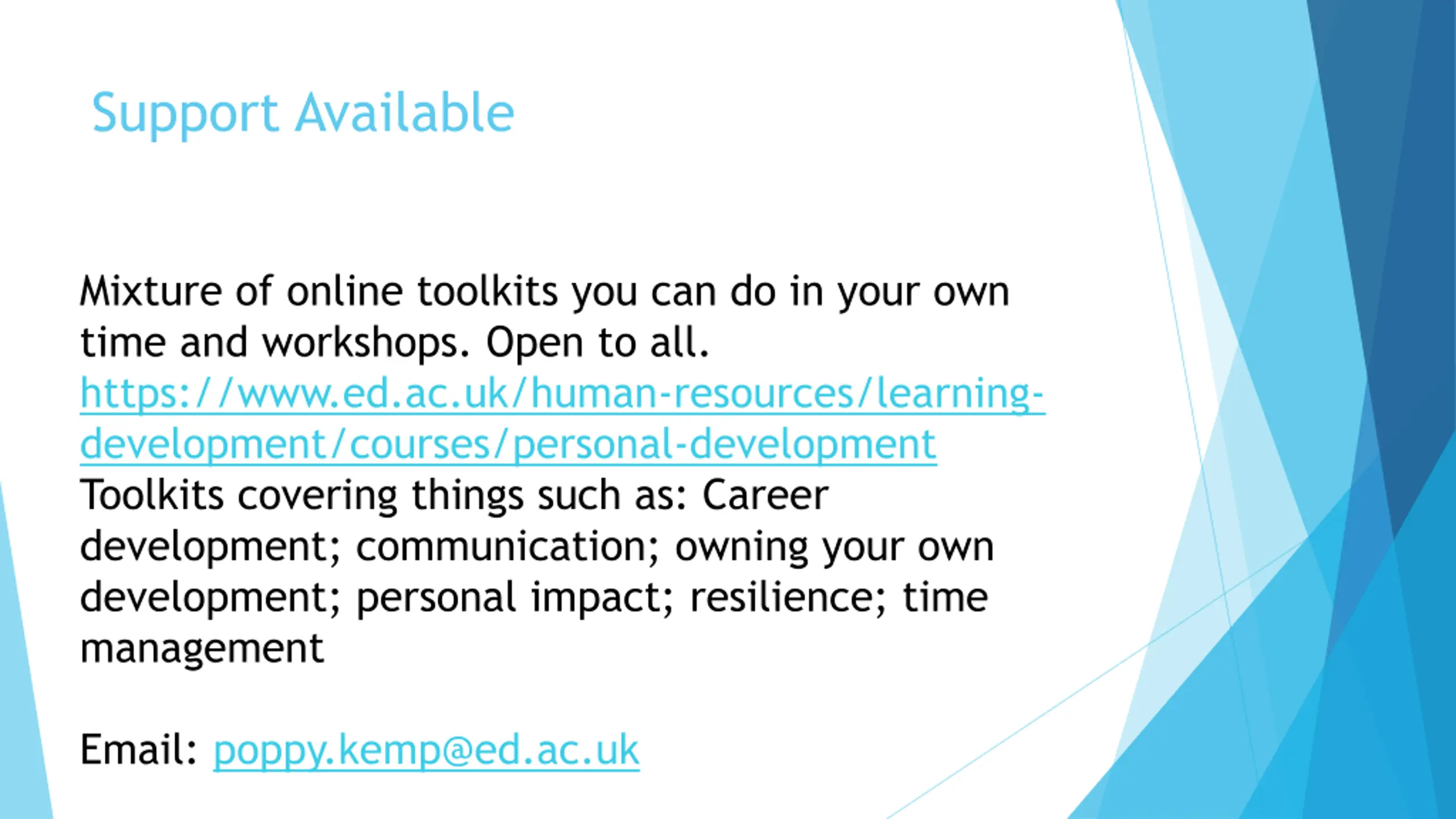 Support Available Mixture of online toolkits you can do in your own time and workshops. Open to all. https://www.ed.ac.uk/human-resources/learning- development/courses/personal-development Toolkits covering things such as: Career development; communication; owning your own development; personal impact; resilience; time management Email: poppy.kemp@ed.ac.uk