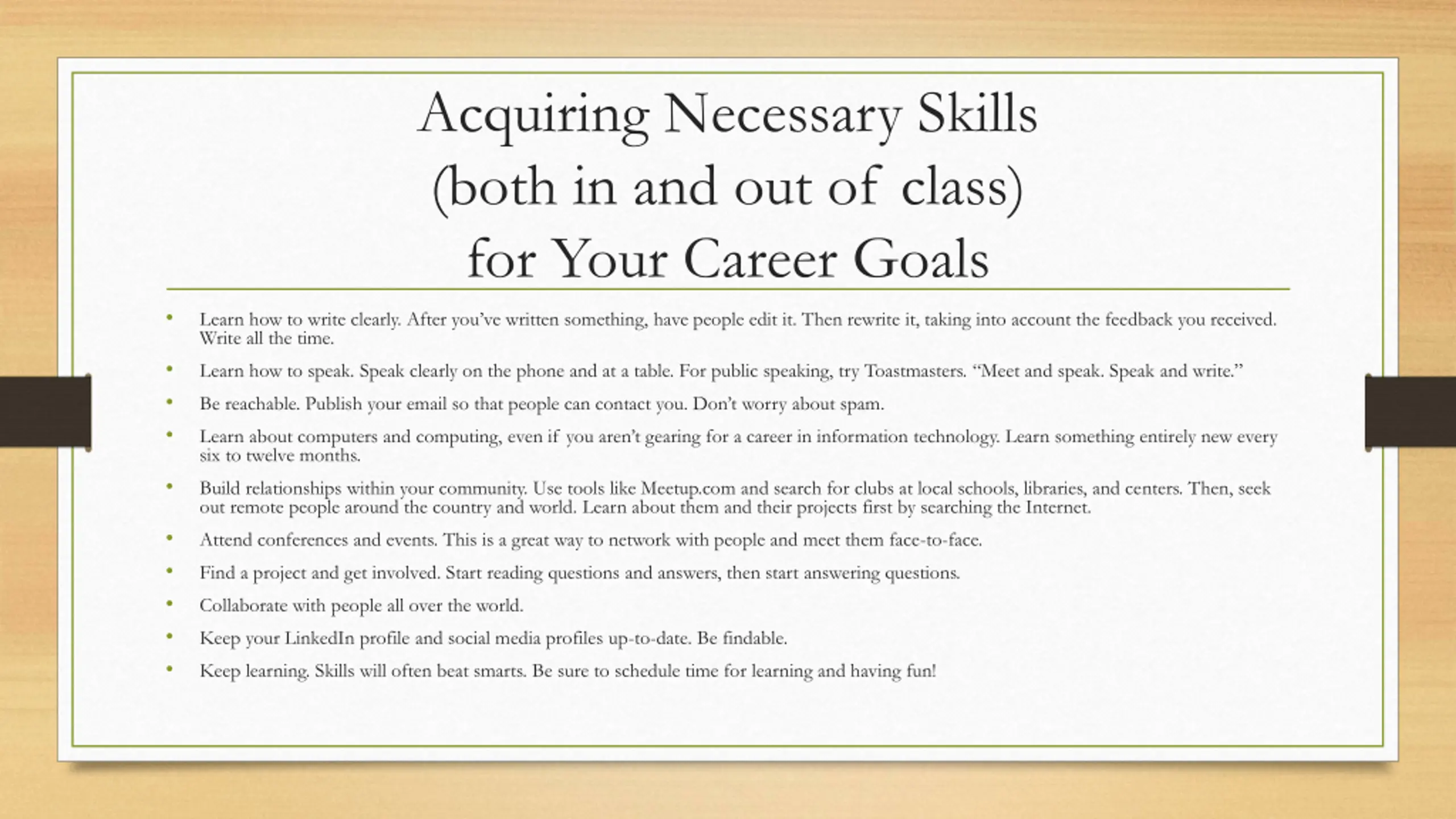Acquiring Necessary Skills (both in and out of class) for Your Career Goals Learn how to write clearly. After you ve written something, have people edit it. Then rewrite it, taking into account the feedback you received. Write all the time. Learn how to speak. Speak clearly on the phone and at a table. For public speaking, try Toastmasters. Meet and speak. Speak and write. Be reachable. Publish your email so that people can contact you. Don t worry about spam. Learn about computers and computing, even if you aren t gearing for a career in information technology. Learn something entirely new every six to twelve months. Build relationships within your community. Use tools like Meetup.com and search for clubs at local schools, libraries, and centers. Then, seek out remote people around the country and world. Learn about them and their projects first by searching the Internet. Attend conferences and events. This is a great way to network with people and meet them face-to-face. Find a project and get involved. Start reading questions and answers, then start answering questions. Collaborate with people all over the world. Keep your LinkedIn profile and social media profiles up-to-date. Be findable. Keep learning. Skills will often beat smarts. Be sure to schedule time for learning and having fun!
