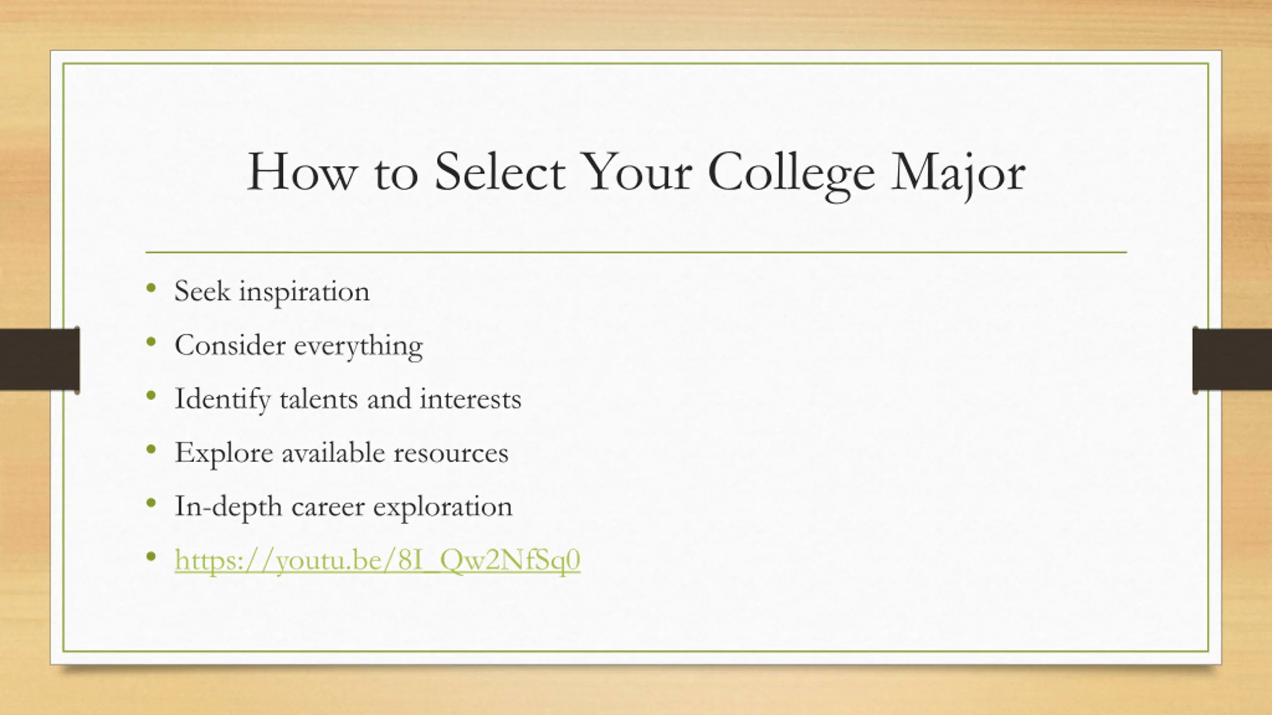 How to Select Your College Major Seek inspiration Consider everything Identify talents and interests Explore available resources In-depth career exploration https://youtu.be/8I_Qw2NfSq0