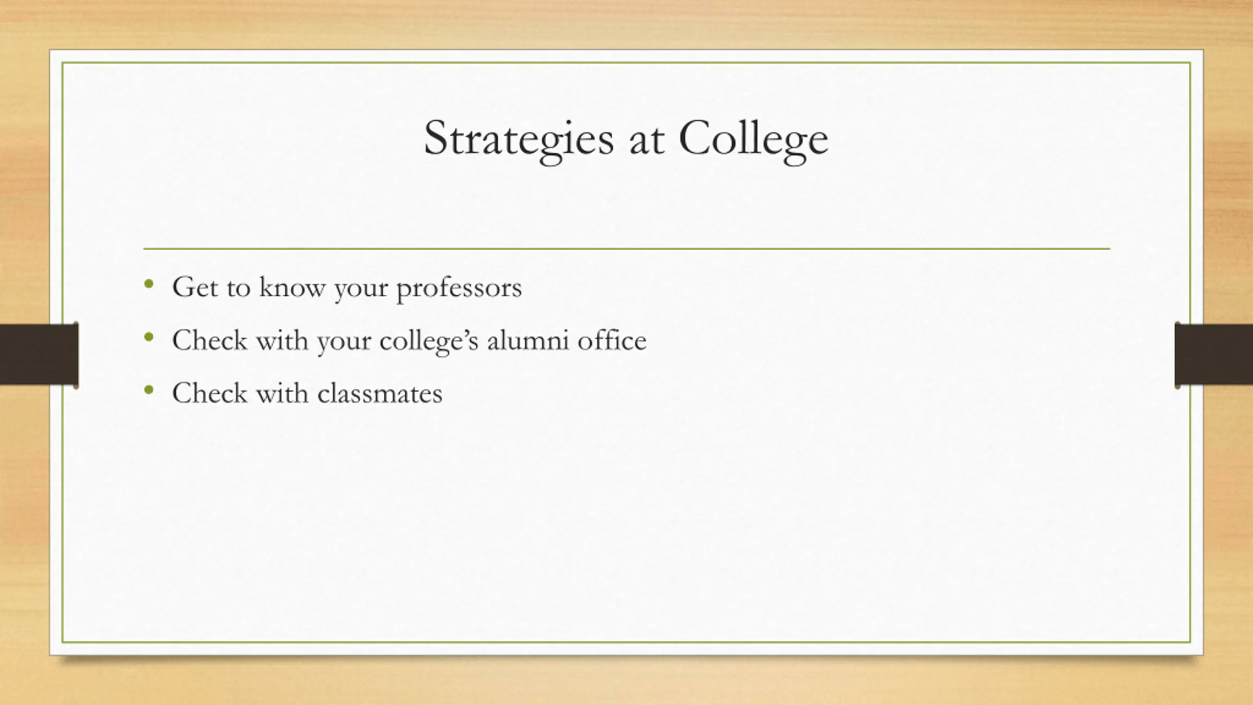 Strategies at College Get to know your professors Check with your college s alumni office Check with classmates