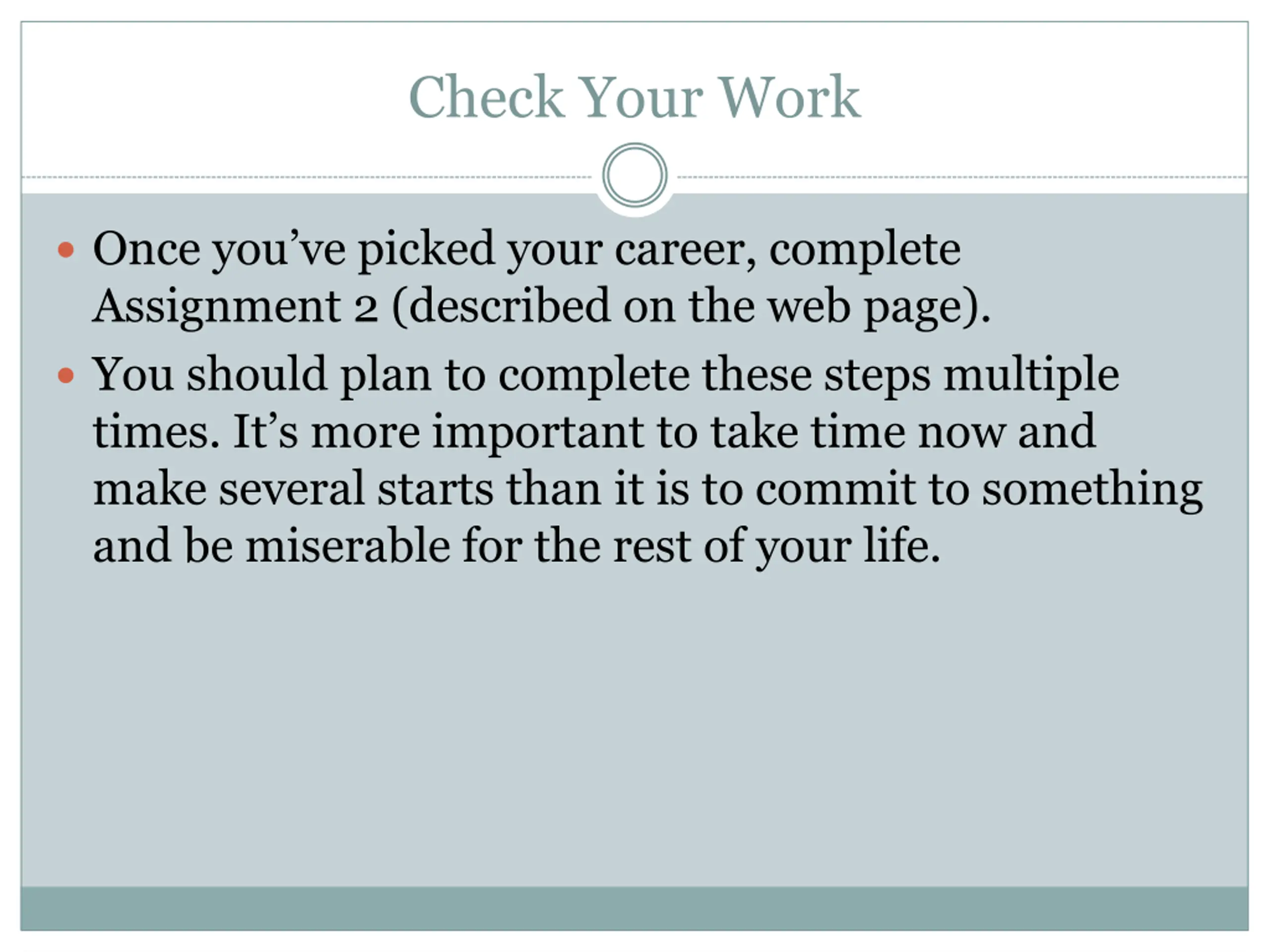 Check Your Work Once you ve picked your career, complete Assignment 2 (described on the web page). You should plan to complete these steps multiple times. It s more important to take time now and make several starts than it is to commit to something and be miserable for the rest of your life.
