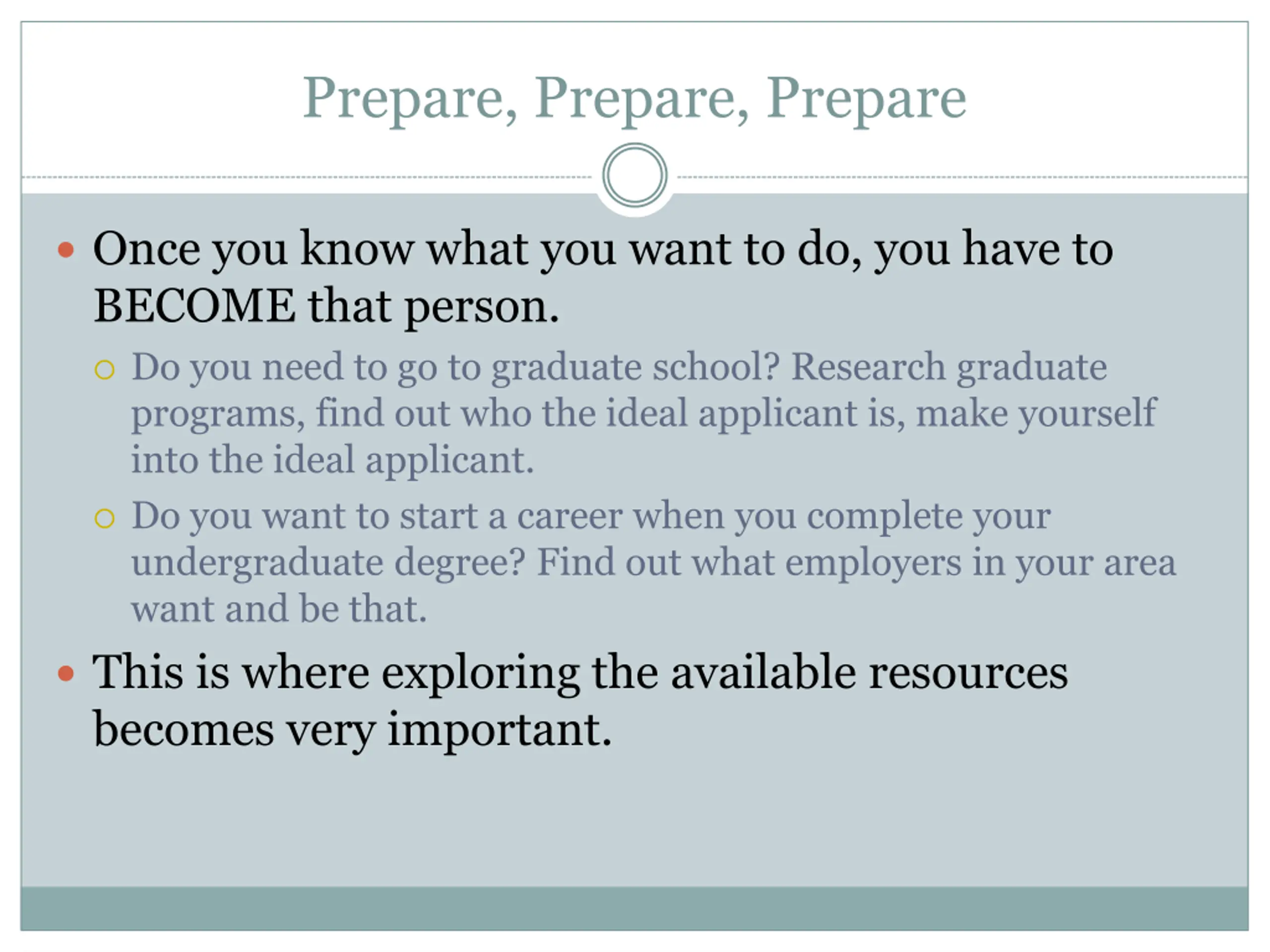 Prepare, Prepare, Prepare Once you know what you want to do, you have to BECOME that person. Do you need to go to graduate school? Research graduate programs, find out who the ideal applicant is, make yourself into the ideal applicant. Do you want to start a career when you complete your undergraduate degree? Find out what employers in your area want and be that. This is where exploring the available resources becomes very important.