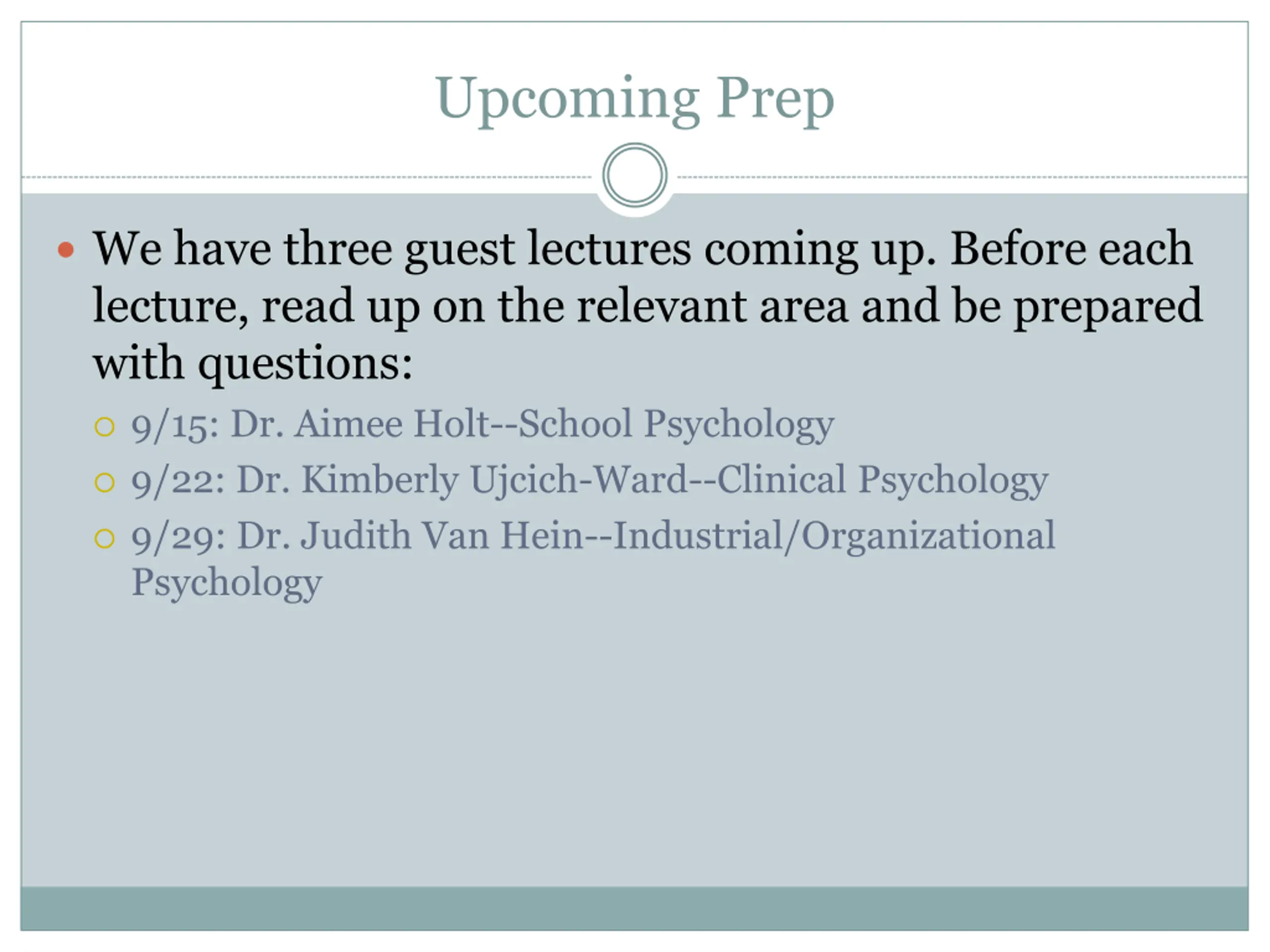 Upcoming Prep We have three guest lectures coming up. Before each lecture, read up on the relevant area and be prepared with questions: 9/15: Dr. Aimee Holt--School Psychology 9/22: Dr. Kimberly Ujcich-Ward--Clinical Psychology 9/29: Dr. Judith Van Hein--Industrial/Organizational Psychology