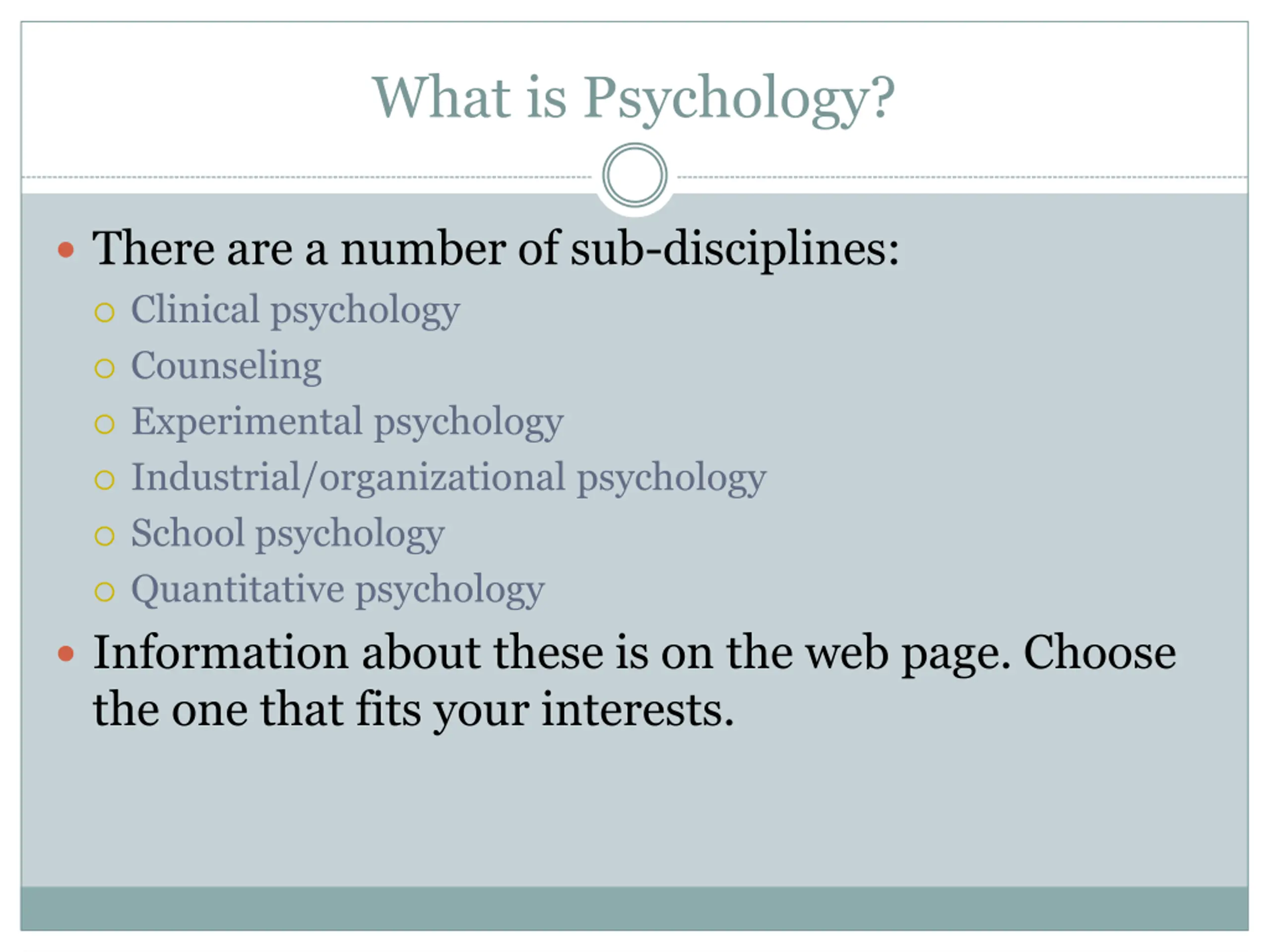 What is Psychology? There are a number of sub-disciplines: Clinical psychology Counseling Experimental psychology Industrial/organizational psychology School psychology Quantitative psychology Information about these is on the web page. Choose the one that fits your interests.