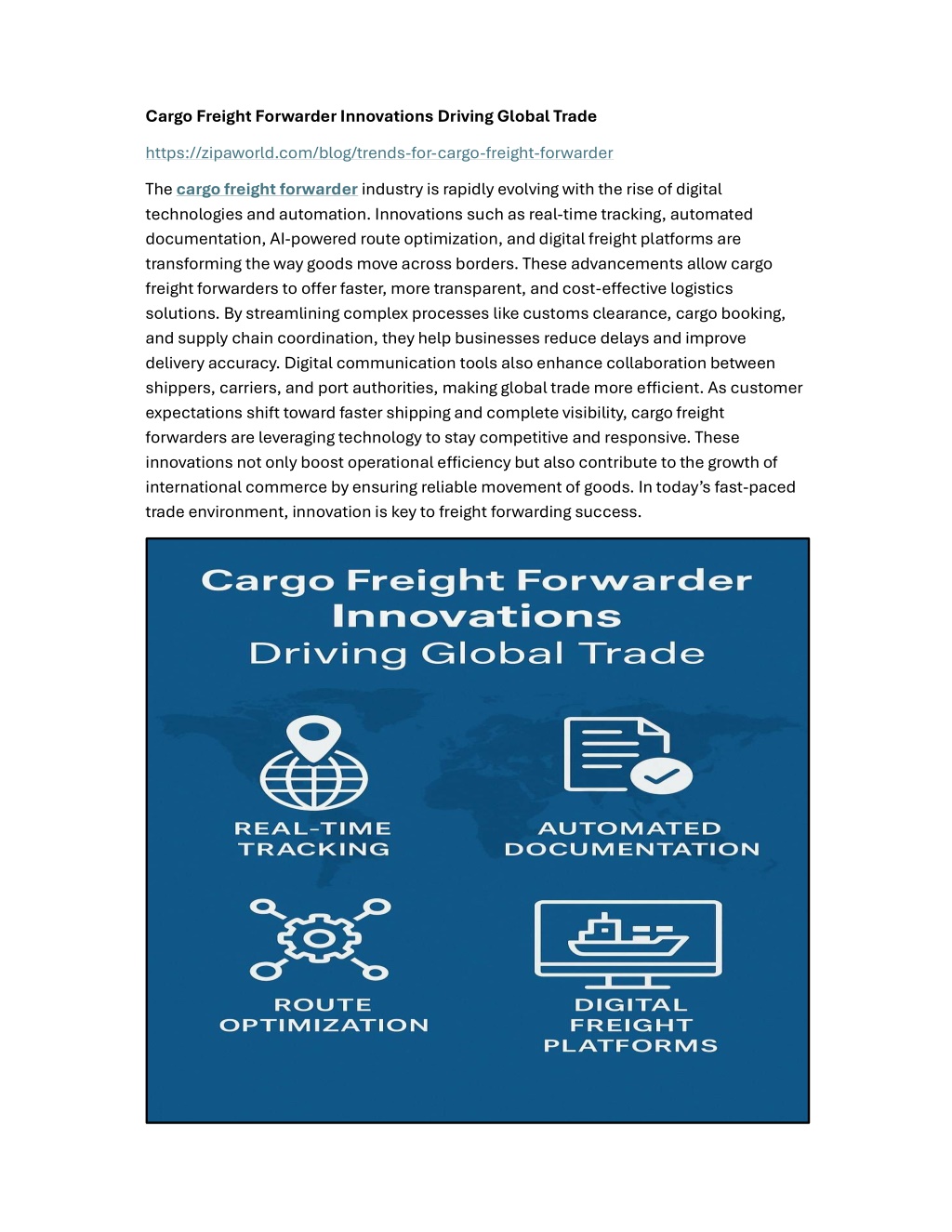 //zipaworld.com/blog/trends-for-cargo-freight-forwardernThe cargo freight forwarder industry is rapidly evolving with the rise of digital technologies and automation. Innovations such as real-time tracking, automated documentation, AI-powered ro
