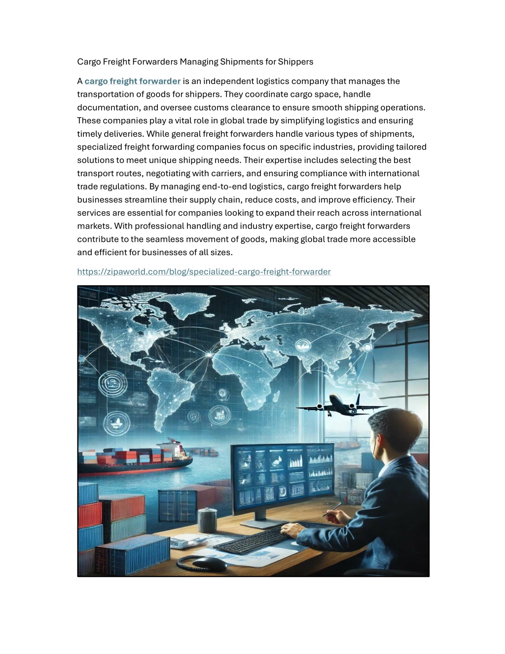 Cargo Freight Forwarders Managing Shipments for Shippers A cargo freight forwarder is an independent logistics company that manages the transportation of goods for shippers. They coordinate cargo space, handle documentation, and oversee customs clearance to ensure smooth shipping operations. These companies play a vital role in global trade by simplifying logistics and ensuring timely deliveries. While general freight forwarders handle various types of shipments, specialized freight forwarding companies focus on specific industries, providing tailored solutions to meet unique shipping needs. Their expertise includes selecting the best transport routes, negotiating with carriers, and ensuring compliance with international trade regulations. By managing end-to-end logistics, cargo freight forwarders help businesses streamline their supply chain, reduce costs, and improve e?iciency. Their services are essential for companies looking to expand their reach across international markets. With professional handling and industry expertise, cargo freight forwarders contribute to the seamless movement of goods, making global trade more accessible and e?icient for businesses of all sizes. https://zipaworld.com/blog/specialized-cargo-freight-forwarder