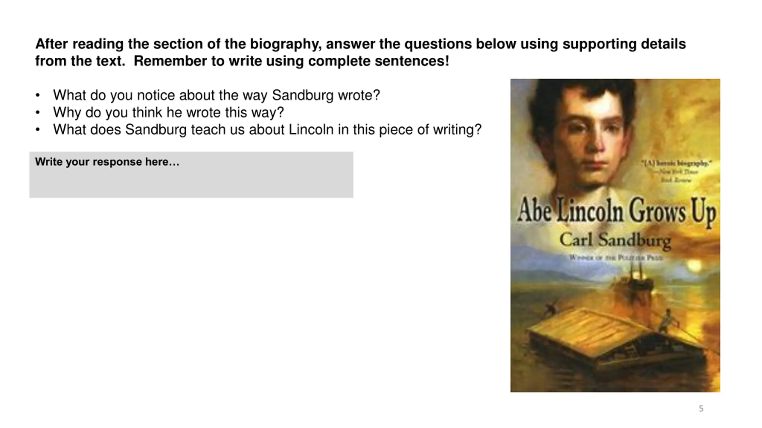 After reading the section of the biography, answer the questions below using supporting details from the text. Remember to write using complete sentences! What do you notice about the way Sandburg wrote? Why do you think he wrote this way? What does Sandburg teach us about Lincoln in this piece of writing? Write your response here 5
