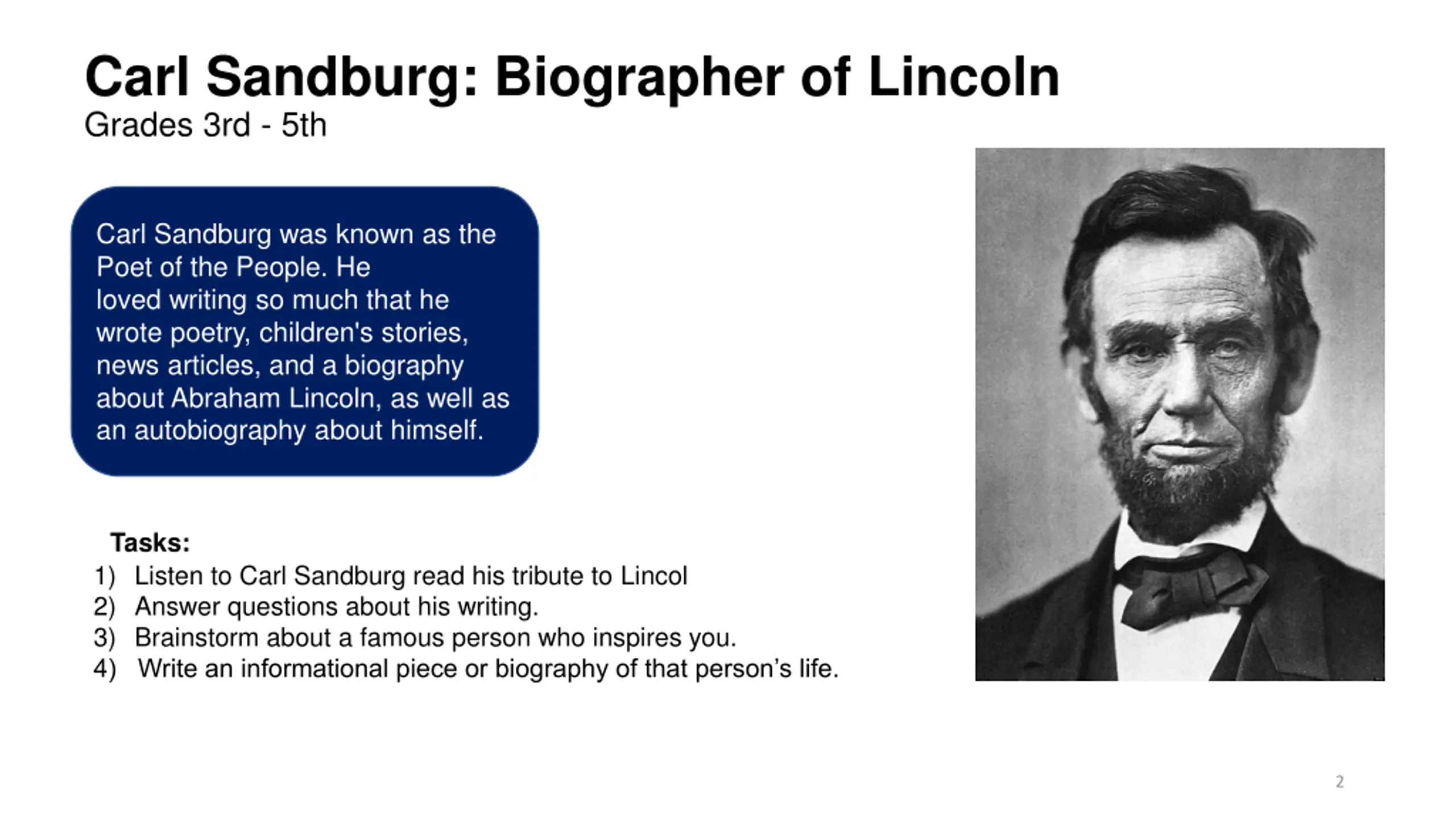 Carl Sandburg: Biographer of Lincoln Grades 3rd - 5th Carl Sandburg was known as the Poet of the People. He loved writing so much that he wrote poetry, children's stories, news articles, and a biography about Abraham Lincoln, as well as an autobiography about himself. Tasks: 1) Listen to Carl Sandburg read his tribute to Lincol 2) Answer questions about his writing. 3) Brainstorm about a famous person who inspires you. 4) Write an informational piece or biography of that person s life. 2