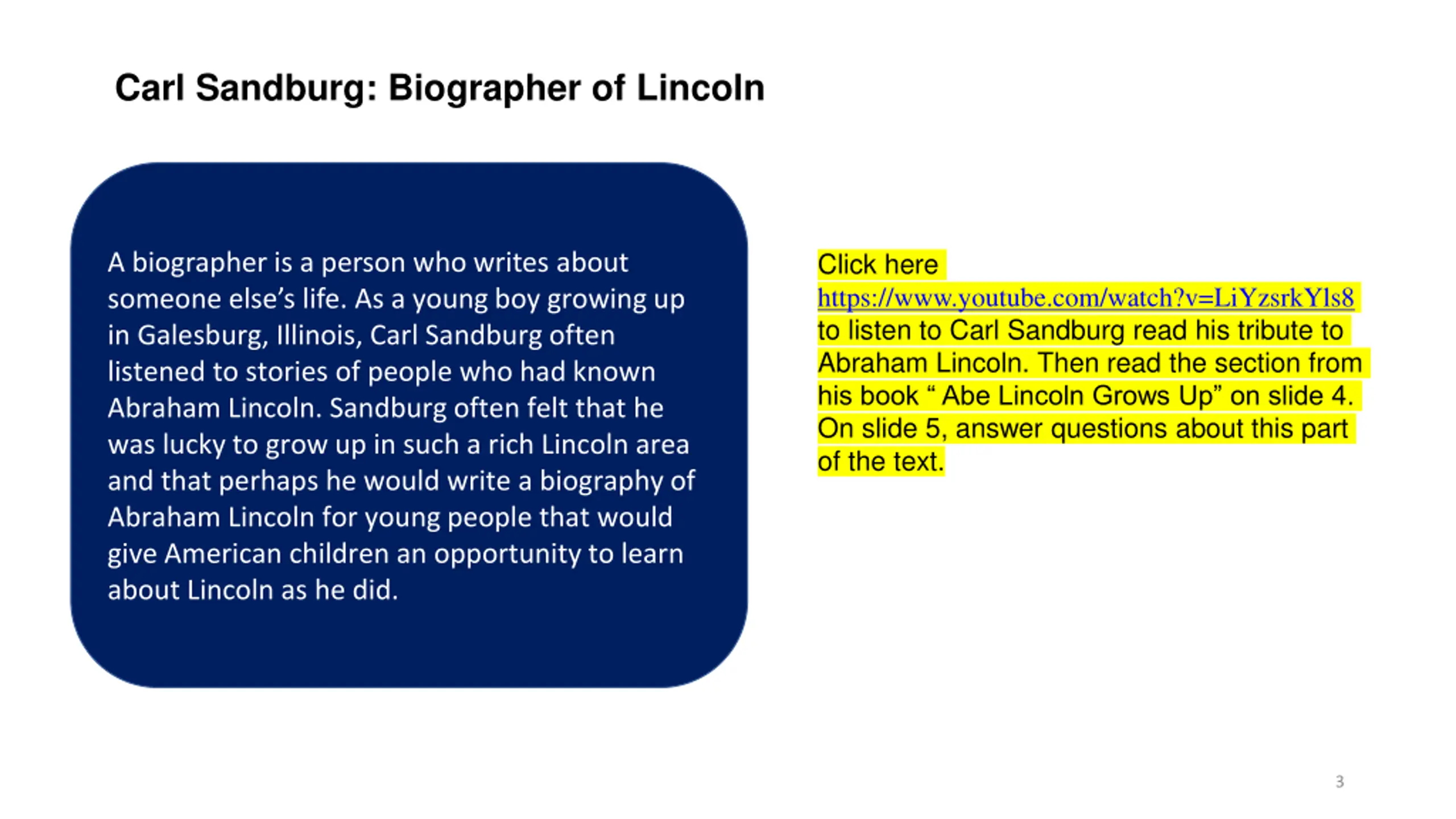Carl Sandburg: Biographer of Lincoln Click here https://www.youtube.com/watch?v=LiYzsrkYls8 to listen to Carl Sandburg read his tribute to Abraham Lincoln. Then read the section from his book Abe Lincoln Grows Up on slide 4. On slide 5, answer questions about this part of the text. A biographer is a person who writes about someone else s life. As a young boy growing up in Galesburg, Illinois, Carl Sandburg often listened to stories of people who had known Abraham Lincoln. Sandburg often felt that he was lucky to grow up in such a rich Lincoln area and that perhaps he would write a biography of Abraham Lincoln for young people that would give American children an opportunity to learn about Lincoln as he did. 3