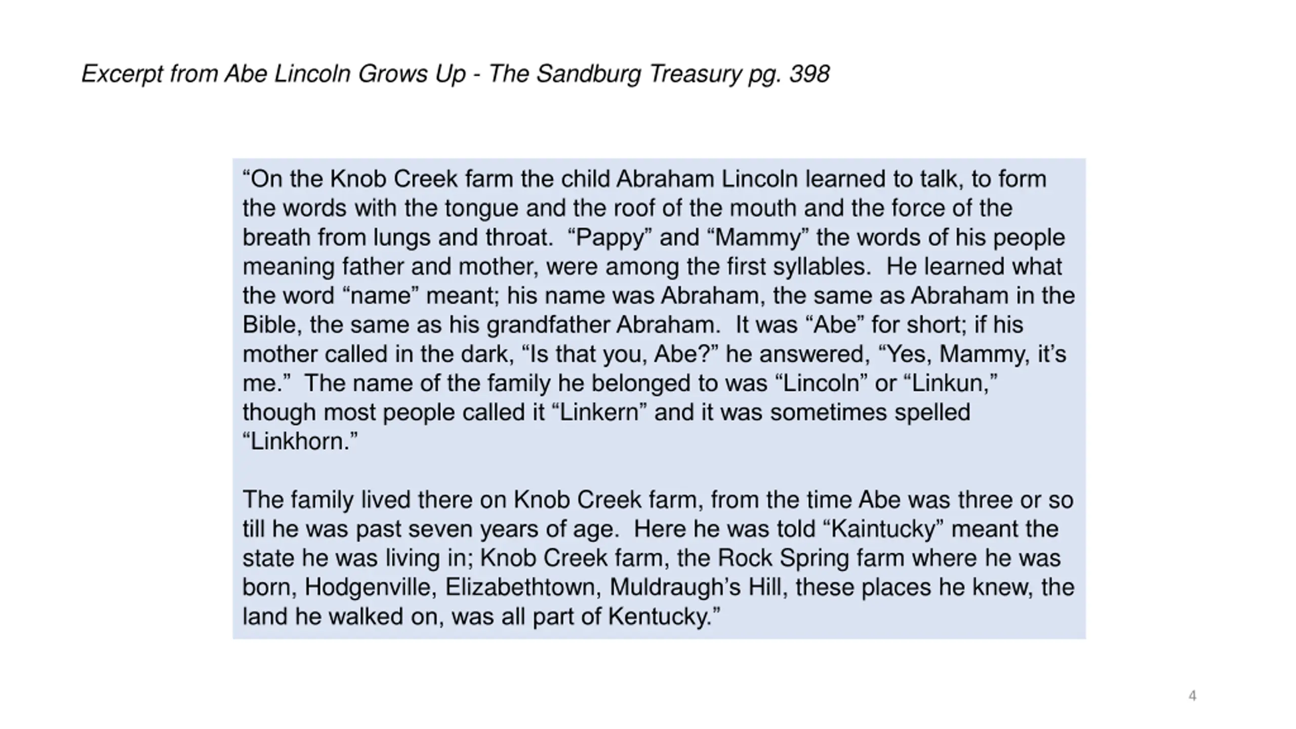 Excerpt from Abe Lincoln Grows Up - The Sandburg Treasury pg. 398 On the Knob Creek farm the child Abraham Lincoln learned to talk, to form the words with the tongue and the roof of the mouth and the force of the breath from lungs and throat. Pappy and Mammy the words of his people meaning father and mother, were among the first syllables. He learned what the word name meant; his name was Abraham, the same as Abraham in the Bible, the same as his grandfather Abraham. It was Abe for short; if his mother called in the dark, Is that you, Abe? he answered, Yes, Mammy, it s me. The name of the family he belonged to was Lincoln or Linkun, though most people called it Linkern and it was sometimes spelled Linkhorn. The family lived there on Knob Creek farm, from the time Abe was three or so till he was past seven years of age. Here he was told Kaintucky meant the state he was living in; Knob Creek farm, the Rock Spring farm where he was born, Hodgenville, Elizabethtown, Muldraugh s Hill, these places he knew, the land he walked on, was all part of Kentucky. 4