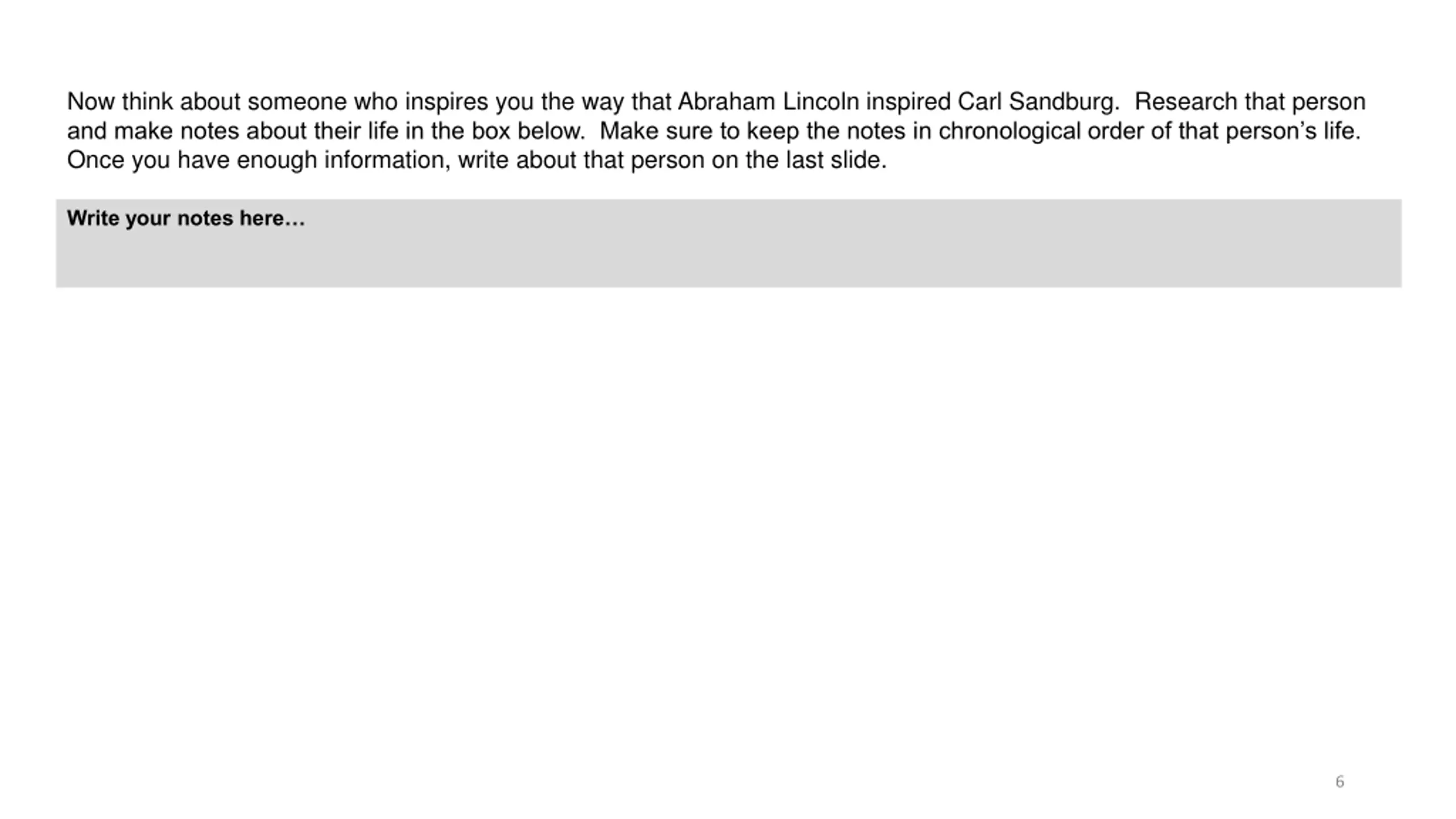 Now think about someone who inspires you the way that Abraham Lincoln inspired Carl Sandburg. Research that person and make notes about their life in the box below. Make sure to keep the notes in chronological order of that person s life. Once you have enough information, write about that person on the last slide. Write your notes here 6