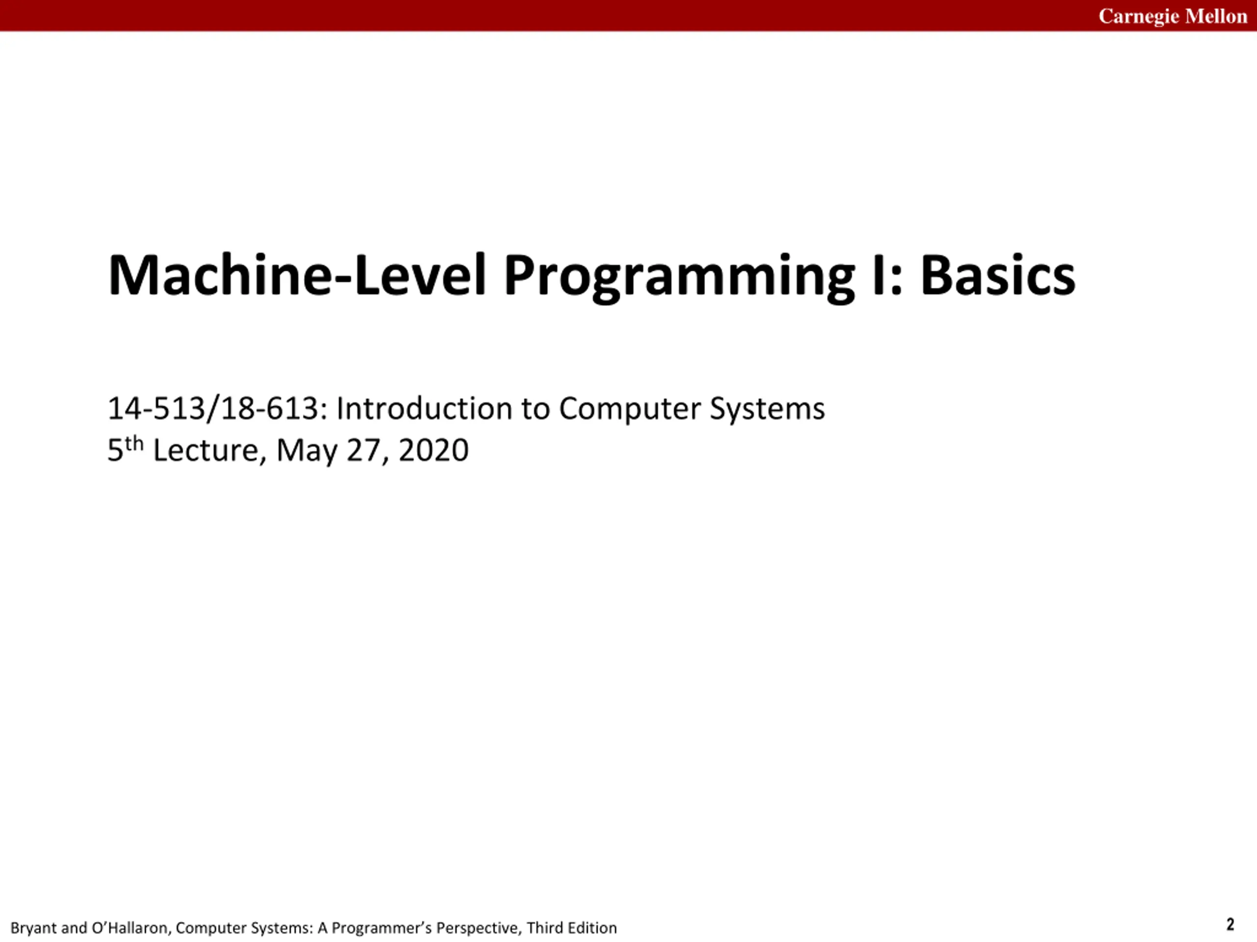 Carnegie Mellon Machine-Level Programming I: Basics 14-513/18-613: Introduction to Computer Systems 5th Lecture, May 27, 2020 2 Bryant and O Hallaron, Computer Systems: A Programmer s Perspective, Third Edition
