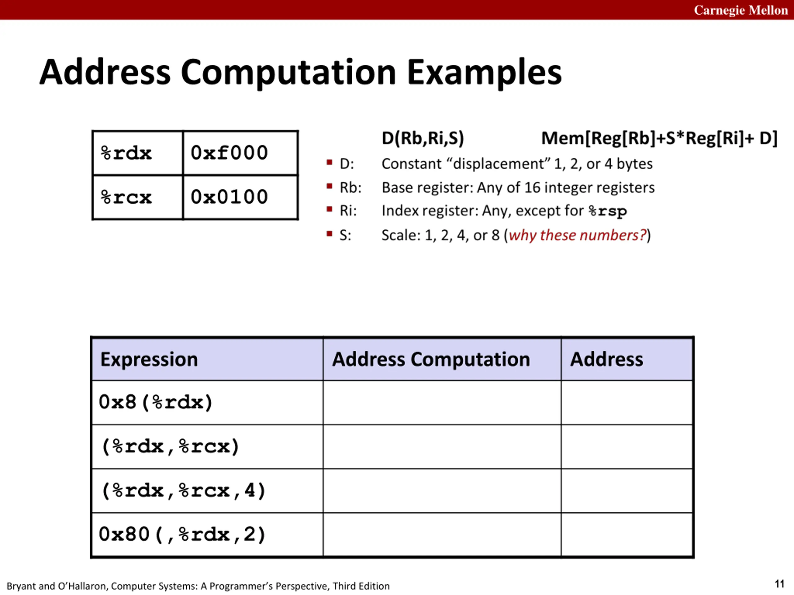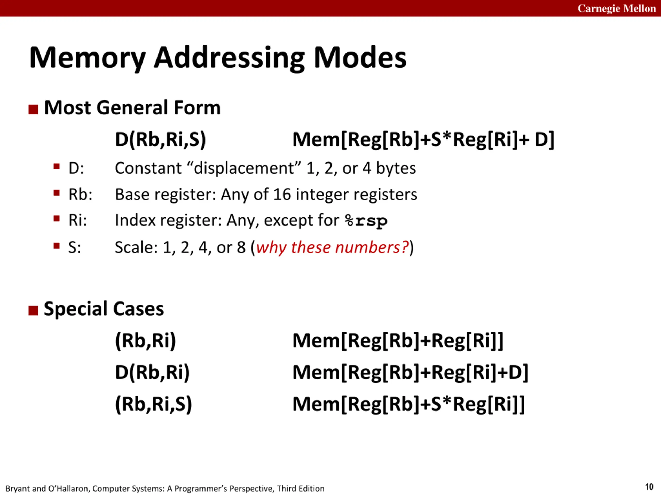 Carnegie Mellon Memory Addressing Modes Most General Form D(Rb,Ri,S) D: Constant displacement 1, 2, or 4 bytes Rb: Base register: Any of 16 integer registers Ri: Index register: Any, except for %rsp S: Scale: 1, 2, 4, or 8 (why these numbers?) Mem[Reg[Rb]+S*Reg[Ri]+ D] Special Cases (Rb,Ri) D(Rb,Ri) (Rb,Ri,S) Mem[Reg[Rb]+Reg[Ri]] Mem[Reg[Rb]+Reg[Ri]+D] Mem[Reg[Rb]+S*Reg[Ri]] 10 Bryant and O Hallaron, Computer Systems: A Programmer s Perspective, Third Edition