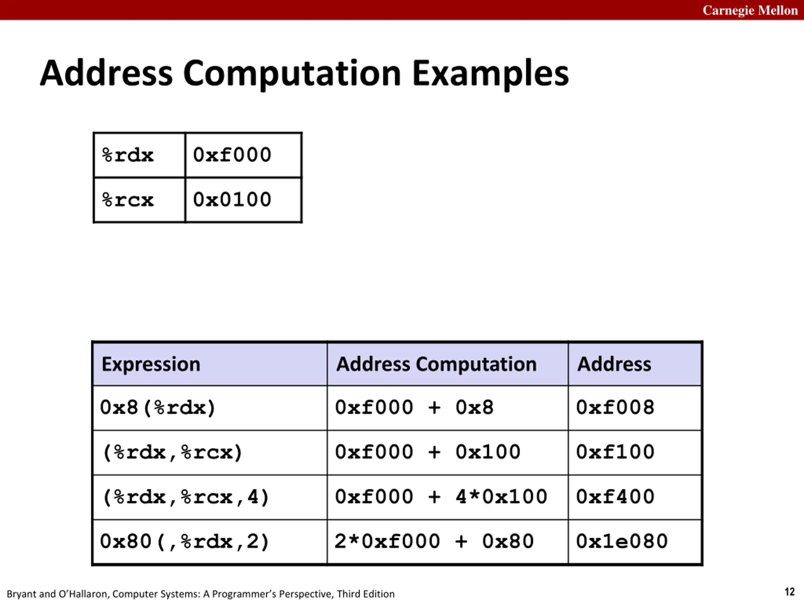 Carnegie Mellon Address Computation Examples %rdx 0xf000 %rcx 0x0100 Expression Expression Address Computation Address Computation Address Address 0x8(%rdx) 0x8(%rdx) 0xf000 + 0x8 0xf008 (%rdx,%rcx) (%rdx,%rcx) 0xf000 + 0x100 0xf100 (%rdx,%rcx,4) (%rdx,%rcx,4) 0xf000 + 4*0x100 0xf400 0x80(,%rdx,2) 0x80(,%rdx,2) 2*0xf000 + 0x80 0x1e080 11 Bryant and O Hallaron, Computer Systems: A Programmer s Perspective, Third Edition