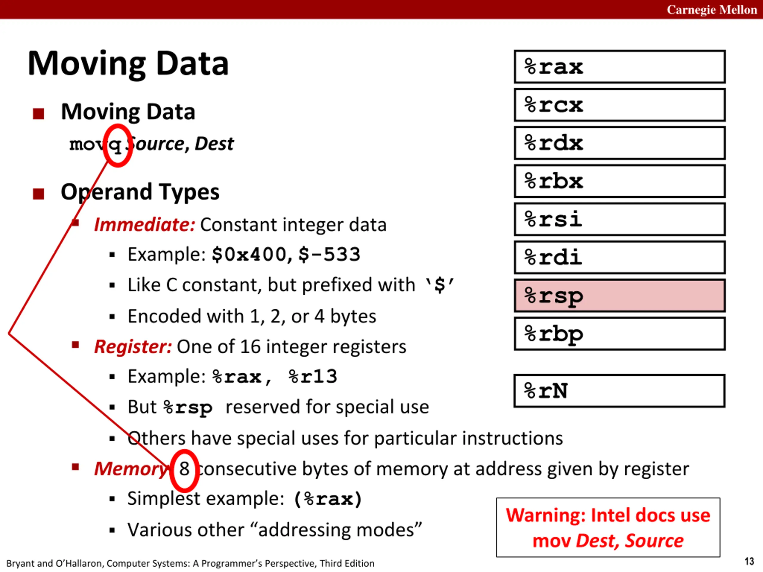 Carnegie Mellon Moving Data %rax %rcx %rdx %rbx %rsi %rdi %rsp %rbp Moving Data movqSource, Dest Operand Types Immediate: Constant integer data Example: $0x400, $-533 Like C constant, but prefixed with $ Encoded with 1, 2, or 4 bytes Register: One of 16 integer registers Example: %rax, %r13 But %rsp reserved for special use %rN Others have special uses for particular instructions Memory: 8 consecutive bytes of memory at address given by register Simplest example: (%rax) Warning: Intel docs use mov Dest, Source Various other addressing modes 13 Bryant and O Hallaron, Computer Systems: A Programmer s Perspective, Third Edition