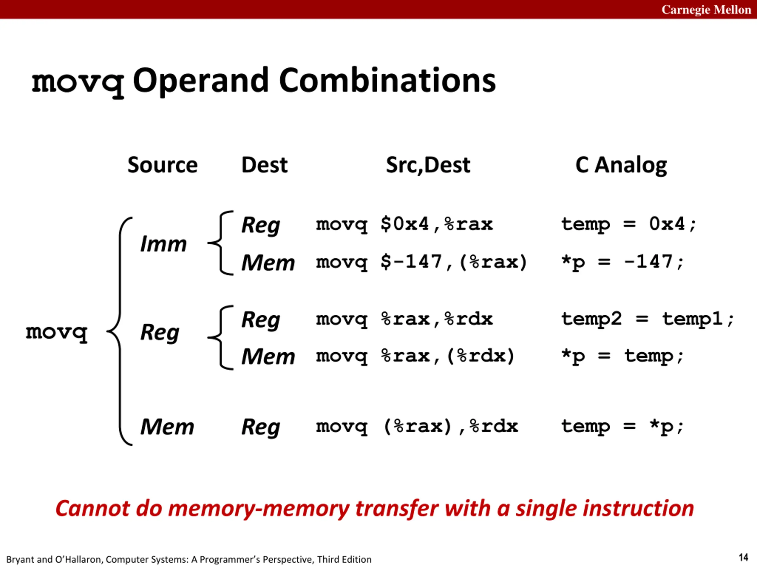 Carnegie Mellon movq Operand Combinations Source Dest Src,Dest C Analog movq $0x4,%rax temp = 0x4; Reg Imm movq $-147,(%rax) *p = -147; Mem movq %rax,%rdx temp2 = temp1; Reg Mem movq Reg movq %rax,(%rdx) *p = temp; movq (%rax),%rdx temp = *p; Mem Reg Cannot do memory-memory transfer with a single instruction 14 Bryant and O Hallaron, Computer Systems: A Programmer s Perspective, Third Edition
