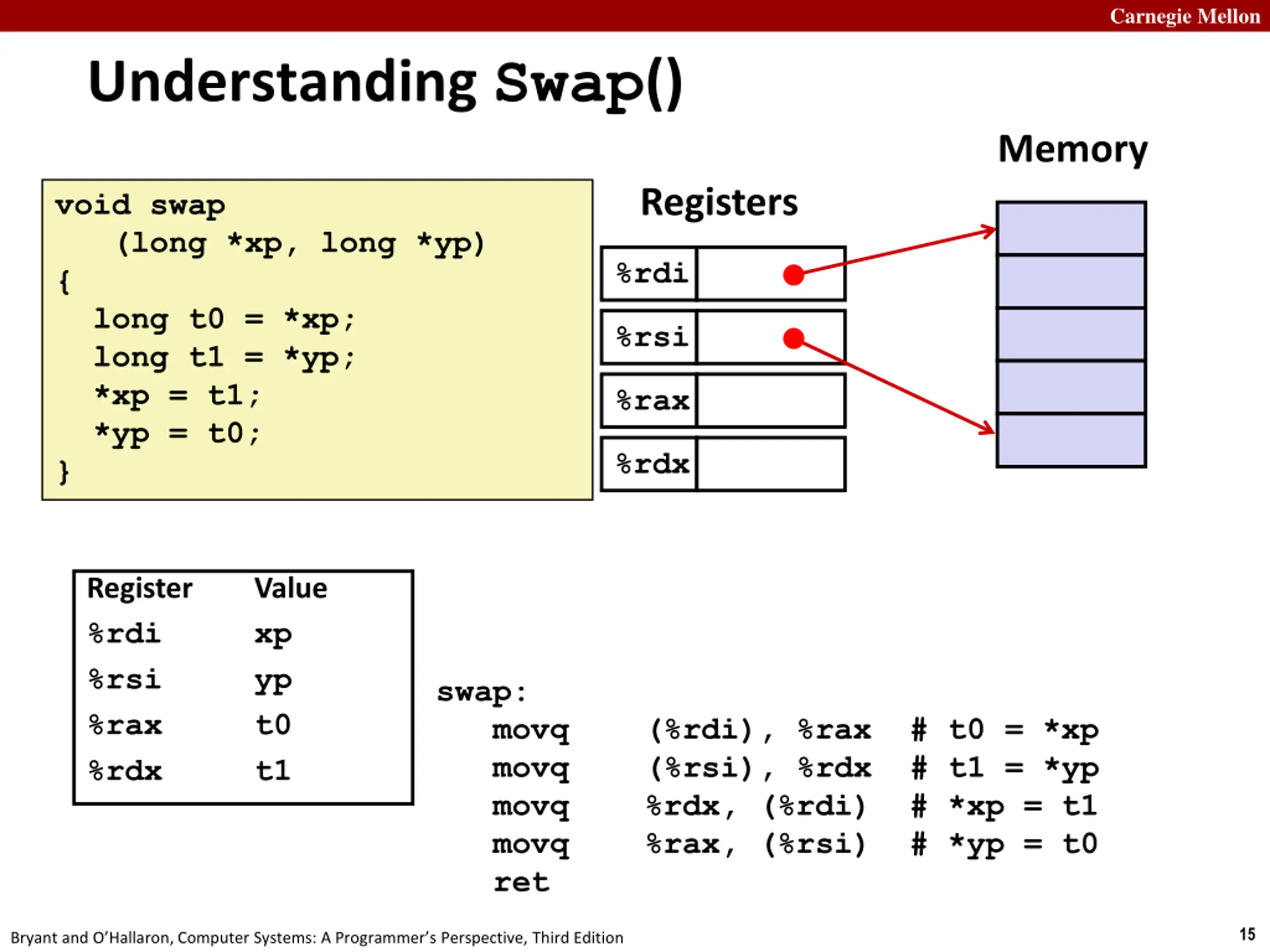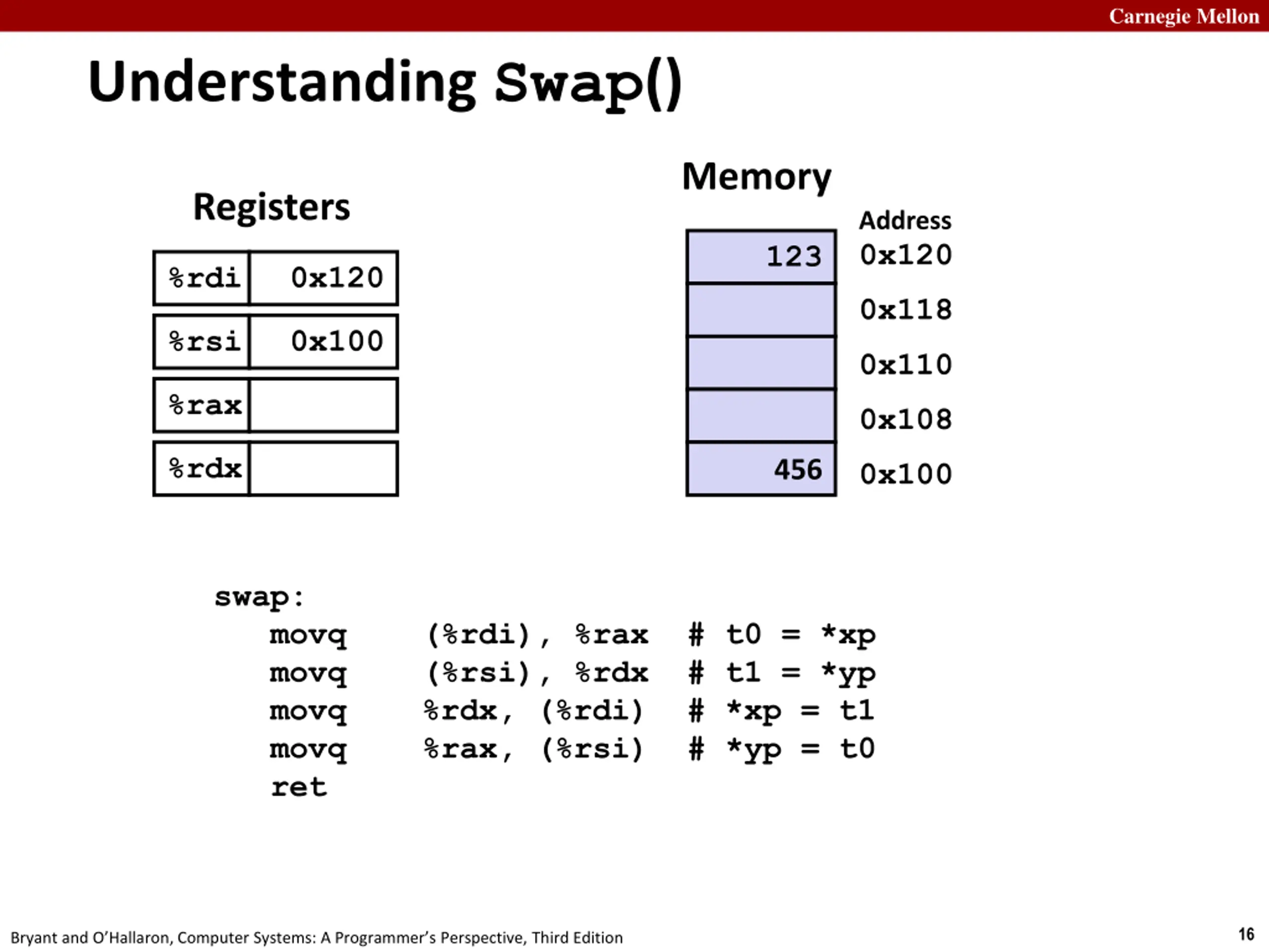 Carnegie Mellon Understanding Swap() Memory Registers void swap (long *xp, long *yp) { long t0 = *xp; long t1 = *yp; *xp = t1; *yp = t0; } %rdi %rsi %rax %rdx Register %rdi %rsi %rax %rdx Value xp yp t0 t1 swap: movq (%rdi), %rax # t0 = *xp movq (%rsi), %rdx # t1 = *yp movq %rdx, (%rdi) # *xp = t1 movq %rax, (%rsi) # *yp = t0 ret 15 Bryant and O Hallaron, Computer Systems: A Programmer s Perspective, Third Edition