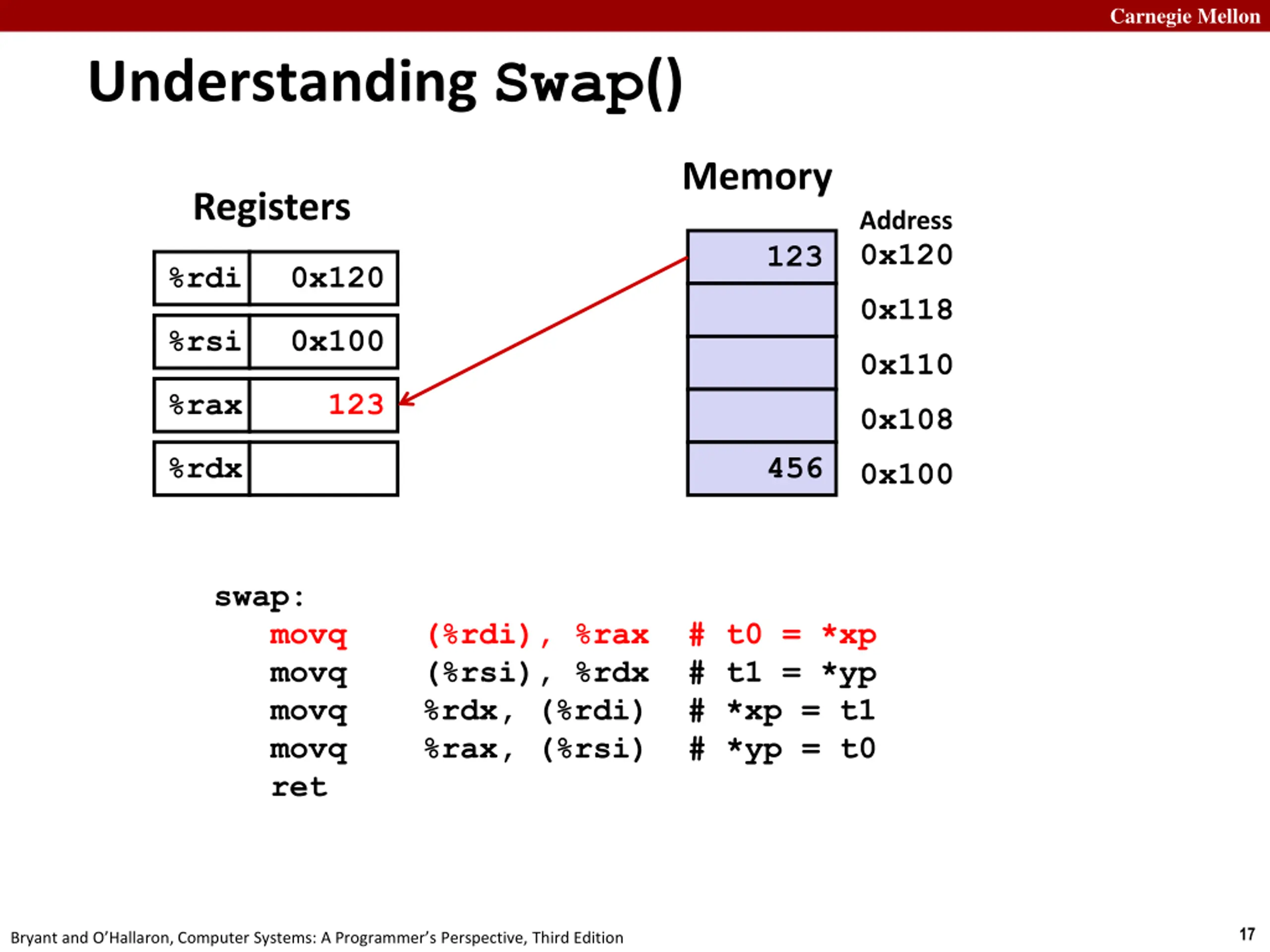 Carnegie Mellon Understanding Swap() Memory Registers Address 0x120 123 %rdi 0x120 0x118 %rsi 0x100 0x110 %rax 0x108 %rdx 456 0x100 swap: movq (%rdi), %rax # t0 = *xp movq (%rsi), %rdx # t1 = *yp movq %rdx, (%rdi) # *xp = t1 movq %rax, (%rsi) # *yp = t0 ret 16 Bryant and O Hallaron, Computer Systems: A Programmer s Perspective, Third Edition