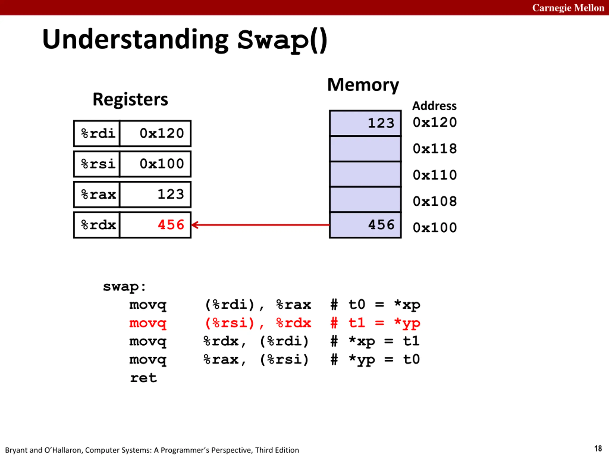 Carnegie Mellon Understanding Swap() Memory Registers Address 0x120 123 %rdi 0x120 0x118 %rsi 0x100 0x110 %rax 123 0x108 %rdx 456 0x100 swap: movq (%rdi), %rax # t0 = *xp movq (%rsi), %rdx # t1 = *yp movq %rdx, (%rdi) # *xp = t1 movq %rax, (%rsi) # *yp = t0 ret 17 Bryant and O Hallaron, Computer Systems: A Programmer s Perspective, Third Edition