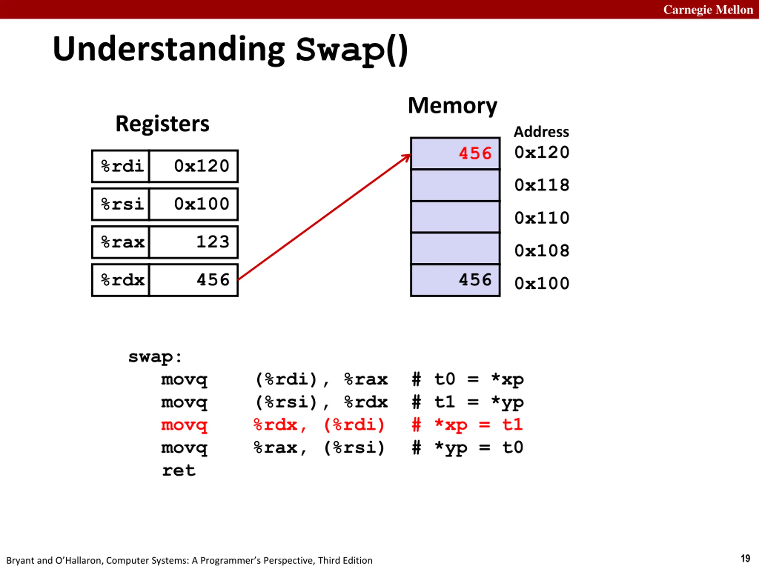 Carnegie Mellon Understanding Swap() Memory Registers Address 0x120 123 %rdi 0x120 0x118 %rsi 0x100 0x110 %rax 123 0x108 %rdx 456 456 0x100 swap: movq (%rdi), %rax # t0 = *xp movq (%rsi), %rdx # t1 = *yp movq %rdx, (%rdi) # *xp = t1 movq %rax, (%rsi) # *yp = t0 ret 18 Bryant and O Hallaron, Computer Systems: A Programmer s Perspective, Third Edition