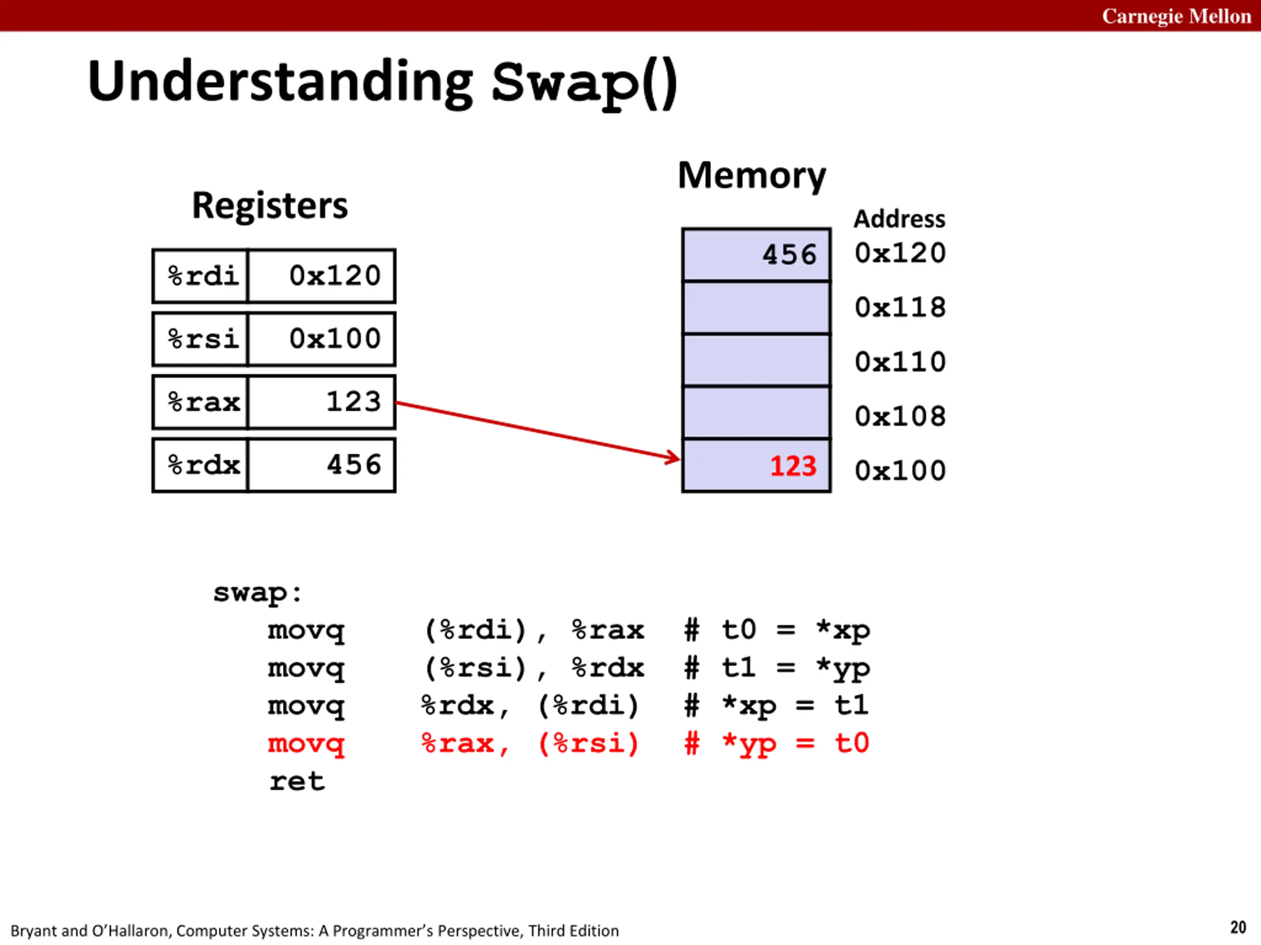 Carnegie Mellon Understanding Swap() Memory Registers Address 0x120 456 %rdi 0x120 0x118 %rsi 0x100 0x110 %rax 123 0x108 %rdx 456 456 0x100 swap: movq (%rdi), %rax # t0 = *xp movq (%rsi), %rdx # t1 = *yp movq %rdx, (%rdi) # *xp = t1 movq %rax, (%rsi) # *yp = t0 ret 19 Bryant and O Hallaron, Computer Systems: A Programmer s Perspective, Third Edition
