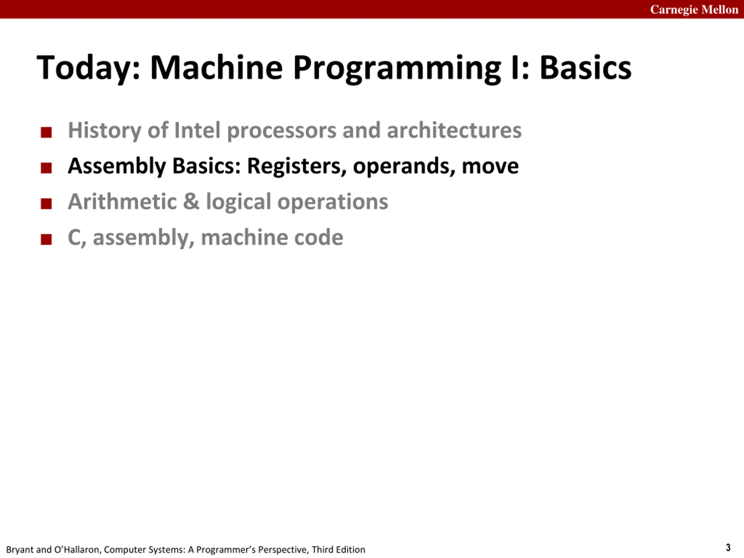 Carnegie Mellon Today: Machine Programming I: Basics History of Intel processors and architectures Assembly Basics: Registers, operands, move Arithmetic & logical operations C, assembly, machine code 3 Bryant and O Hallaron, Computer Systems: A Programmer s Perspective, Third Edition