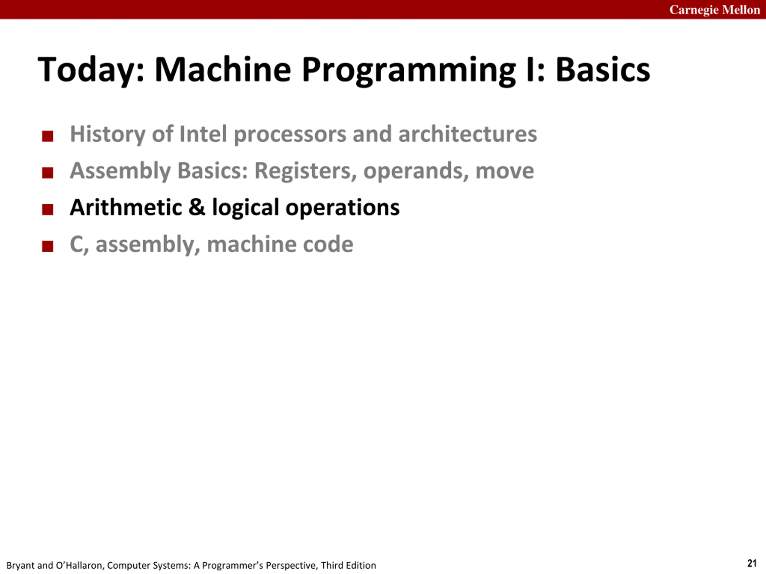 Carnegie Mellon Today: Machine Programming I: Basics History of Intel processors and architectures Assembly Basics: Registers, operands, move Arithmetic & logical operations C, assembly, machine code 21 Bryant and O Hallaron, Computer Systems: A Programmer s Perspective, Third Edition