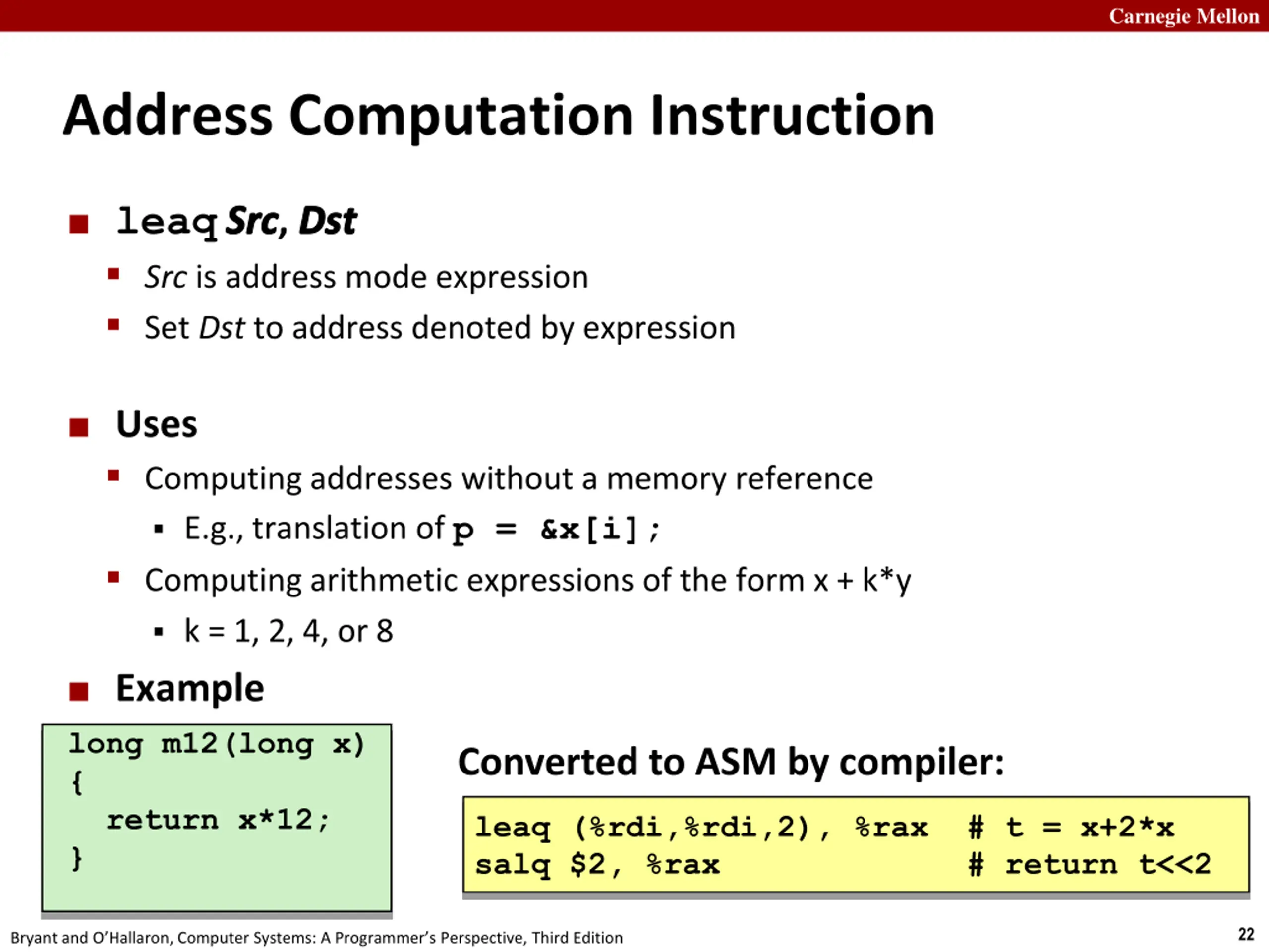 Carnegie Mellon Address Computation Instruction leaqSrc Src is address mode expression Set Dst to address denoted by expression Src, Dst Dst Uses Computing addresses without a memory reference E.g., translation of p = &x[i]; Computing arithmetic expressions of the form x + k*y k = 1, 2, 4, or 8 Example long m12(long x) { return x*12; } Converted to ASM by compiler: leaq (%rdi,%rdi,2), %rax # t = x+2*x salq $2, %rax # return t<<2 22 Bryant and O Hallaron, Computer Systems: A Programmer s Perspective, Third Edition